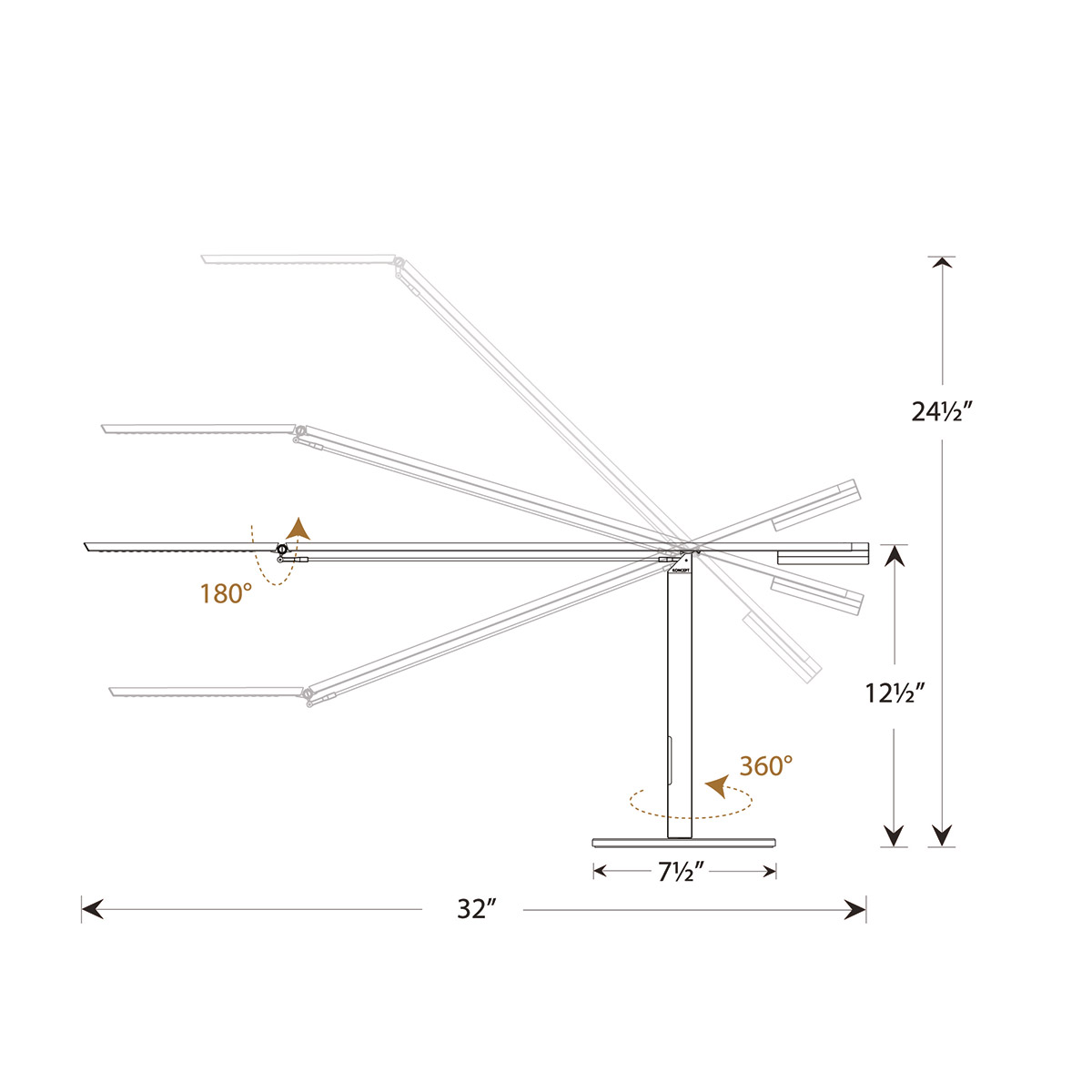 Gehalten wird der gleichsam schwerelos im Raum schwebende Arm von einem schlanken Fuß, der um 360° gedreht werden kann. Der Leuchtenkopf ist seinerseits um 180° drehbar und unterstreicht die flexible Handhabung der Koncept Equo Tischleuchte.