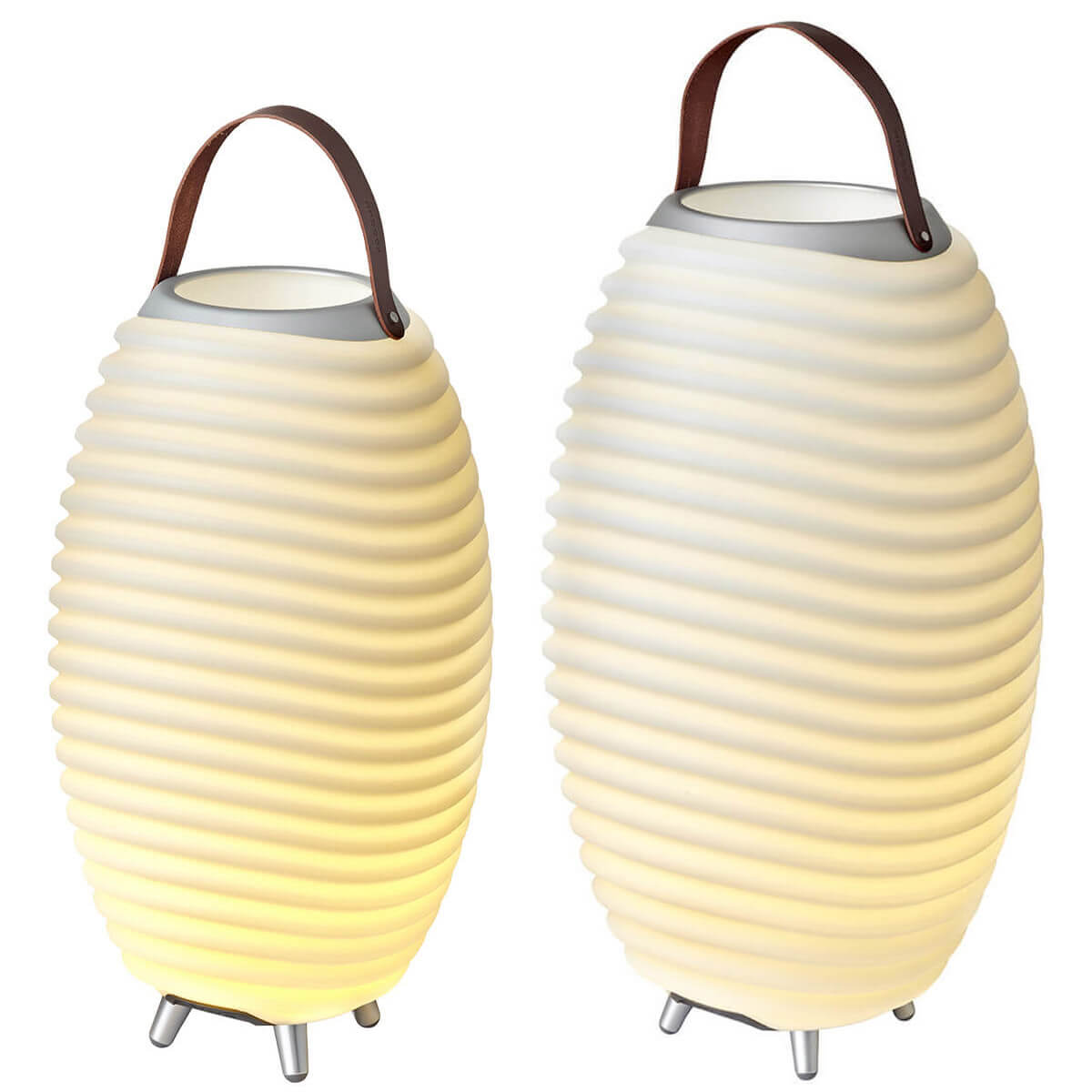 Während die mittlere und große Kooduu Synergy als Bodenleuchten konzipiert worden sind, kann die Small-Version auch auf Tischflächen oder Kommoden Platz finden. Alle Versionen verfügen über ein wasserdichtes Innenfach, das sich als Behälter für Getränke, Eiswürfel oder Blumengestecke eignet. Das Fassungsvermögen beträgt bei der Synergy Small 1,3 Liter, bei der Synergy Stereo LED Medium 2 Liter und bei der Synergy Stereo LED Large 4,8 Liter.