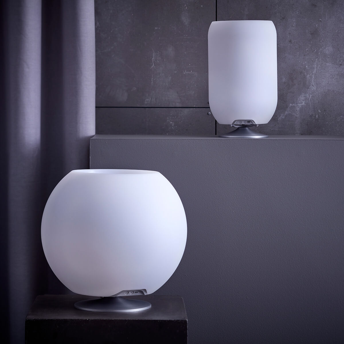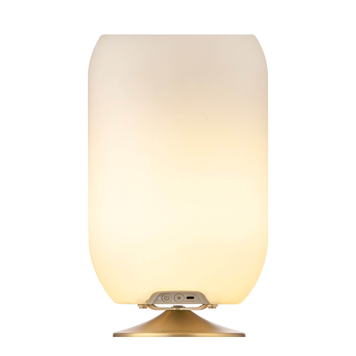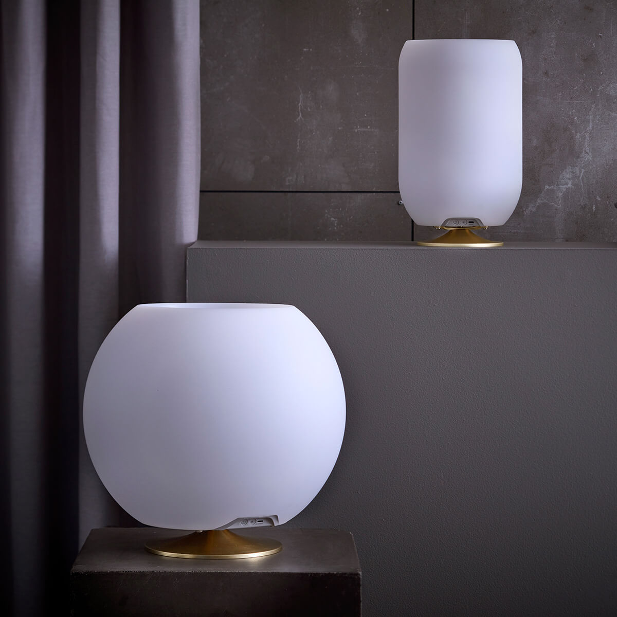 Die minimalistische Linie der Kooduu Atmos Lautsprecherlampe verdankt sich dem dänischen Designstudio Jacob Jensen Design. Der gerundete Fuß aus Messing oder gebürstetem Aluminium unterstreicht die moderne und zugleich zeitlose Ästhetik und macht die Lampe zu einem eindrucksvollen Hingucker auf Beistelltischen, Theken oder Tischflächen auf Terrasse und Balkon.