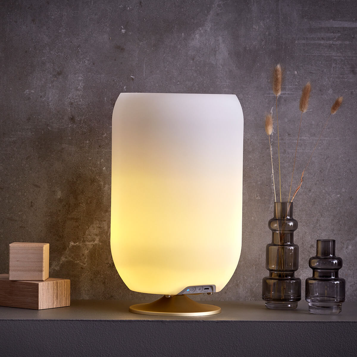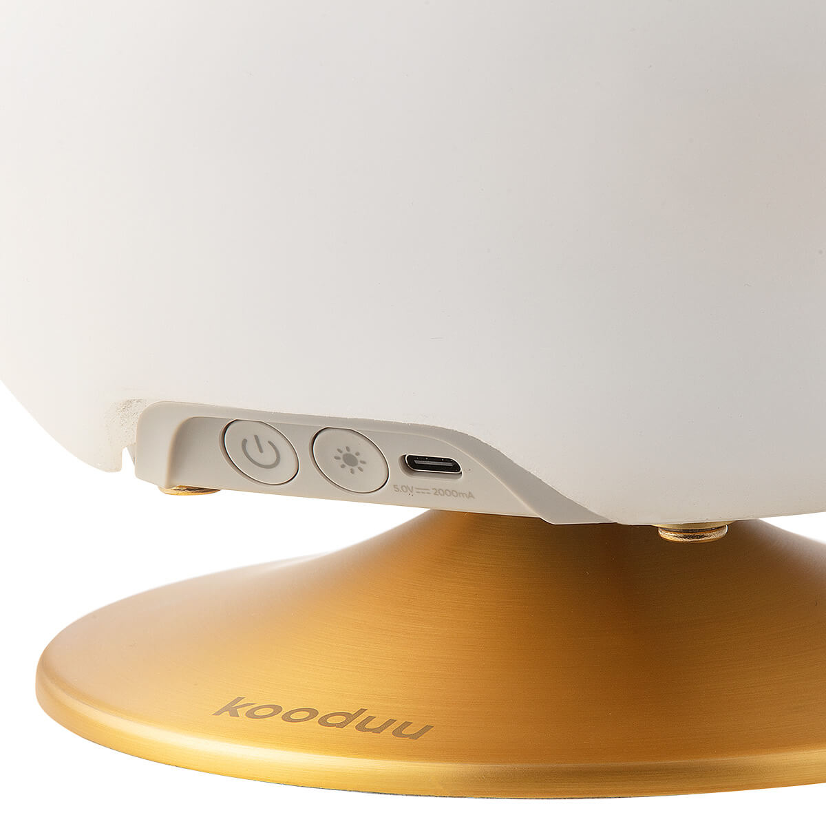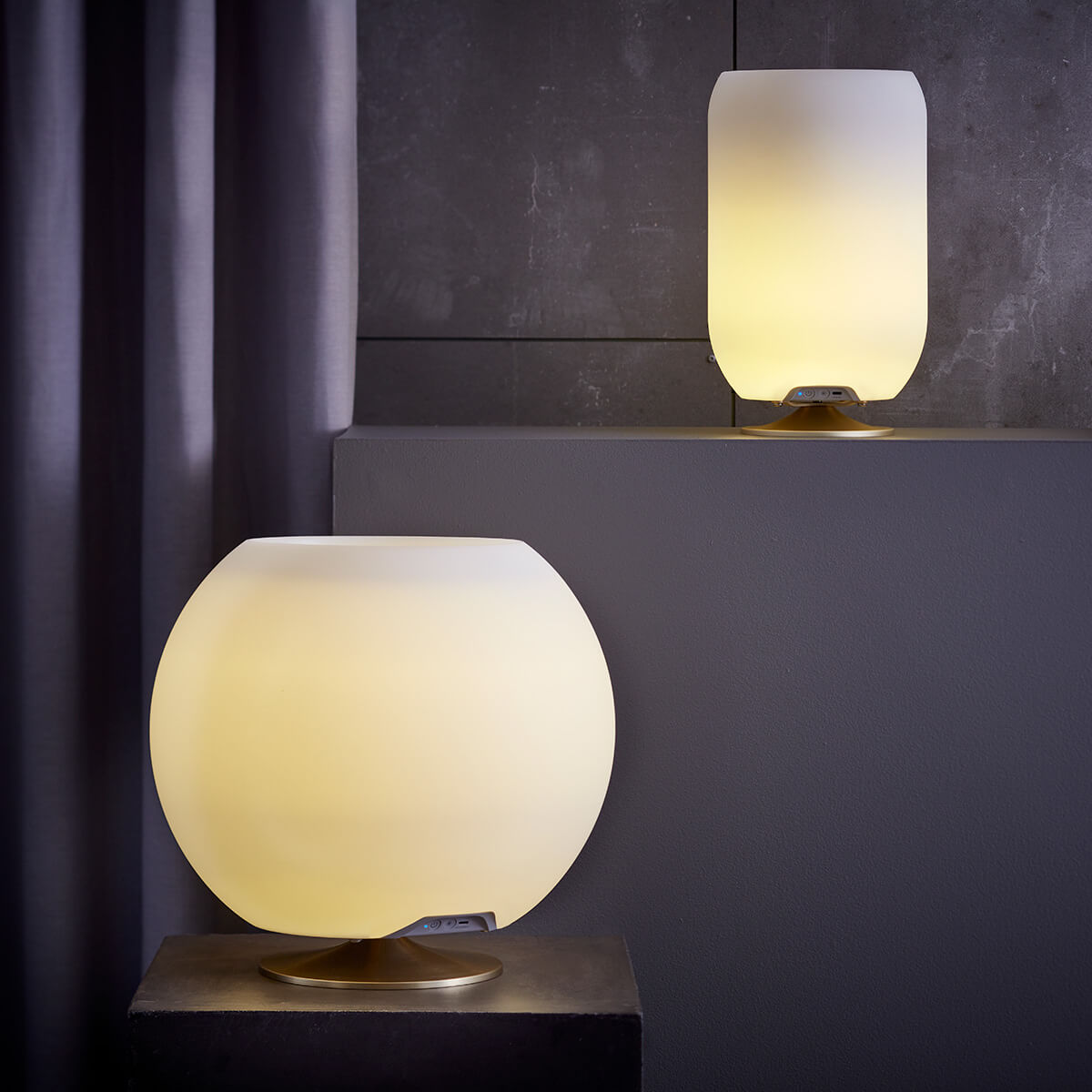 Die minimalistische Linie der Kooduu Atmos Lautsprecherlampe verdankt sich dem dänischen Designstudio Jacob Jensen Design. Der gerundete Fuß aus Messing oder gebürstetem Aluminium unterstreicht die moderne und zugleich zeitlose Ästhetik und macht die Lampe zu einem eindrucksvollen Hingucker auf Beistelltischen, Theken oder Tischflächen auf Terrasse und Balkon.