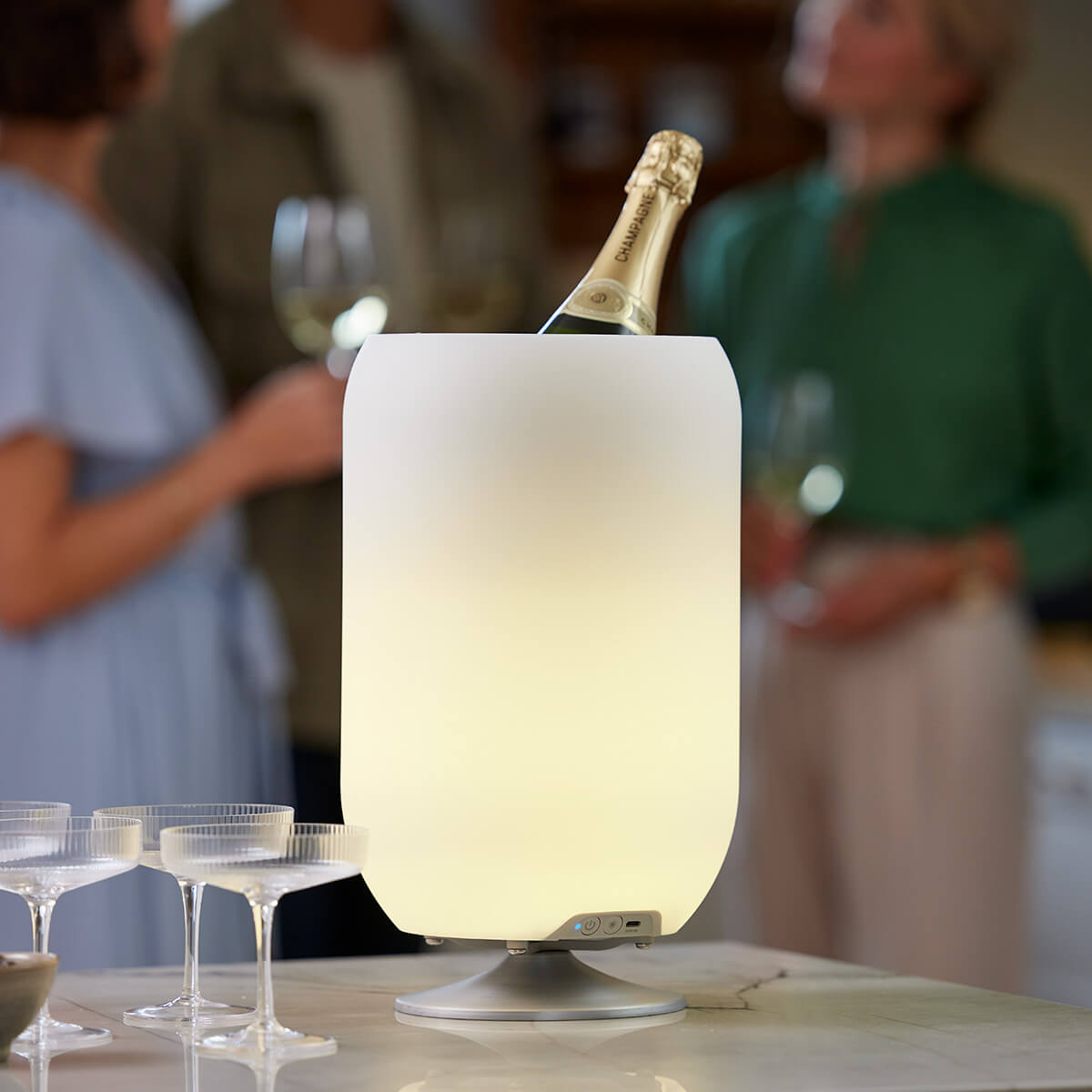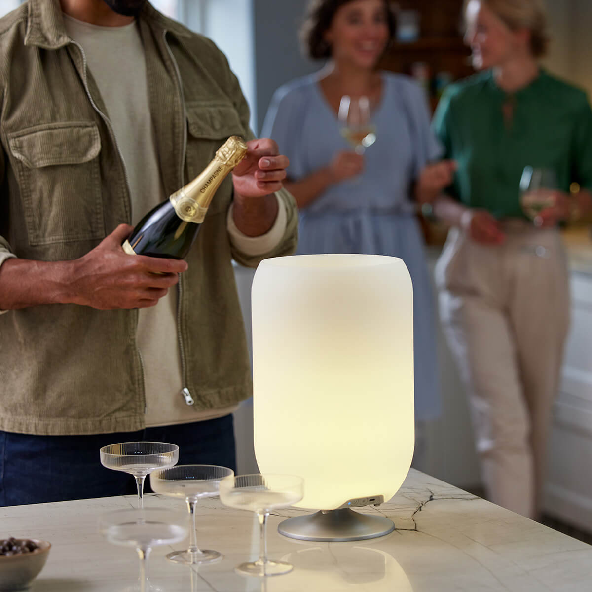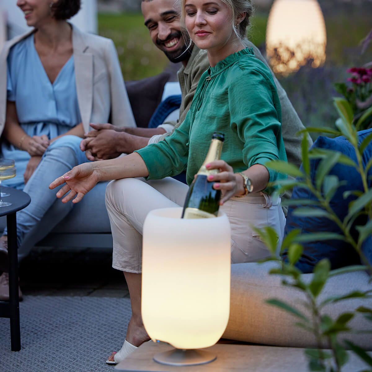 Zudem verbirgt sich im Inneren der Akkulampe ein wasserdichtes Innenfach, das als Getränkekühler oder Behältnis für Dekokonzepte verwendet werden kann. Die zylindrische, schlanke Form bietet hierbei Platz für bis zu eine Wein- oder Sektflasche – die perfekte Größe für ein romantisches Tête-à-Tête auf der Couch oder den Sektempfang in kleiner Runde auf dem Balkon.
