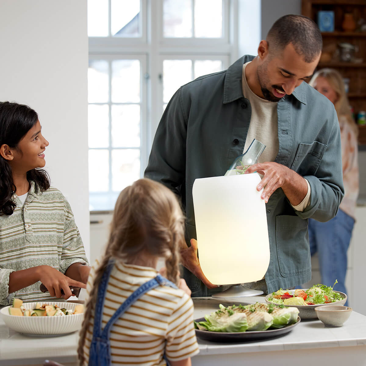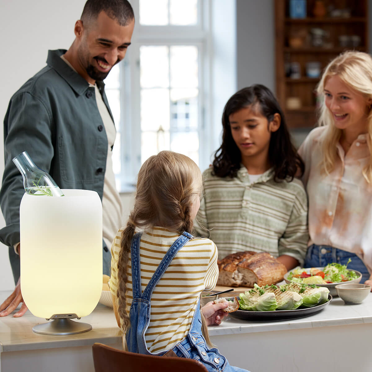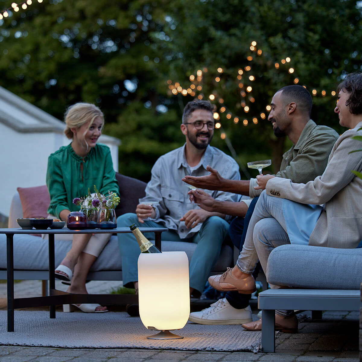 Zudem verbirgt sich im Inneren der Akkulampe ein wasserdichtes Innenfach, das als Getränkekühler oder Behältnis für Dekokonzepte verwendet werden kann. Die zylindrische, schlanke Form bietet hierbei Platz für bis zu eine Wein- oder Sektflasche – die perfekte Größe für ein romantisches Tête-à-Tête auf der Couch oder den Sektempfang in kleiner Runde auf dem Balkon.