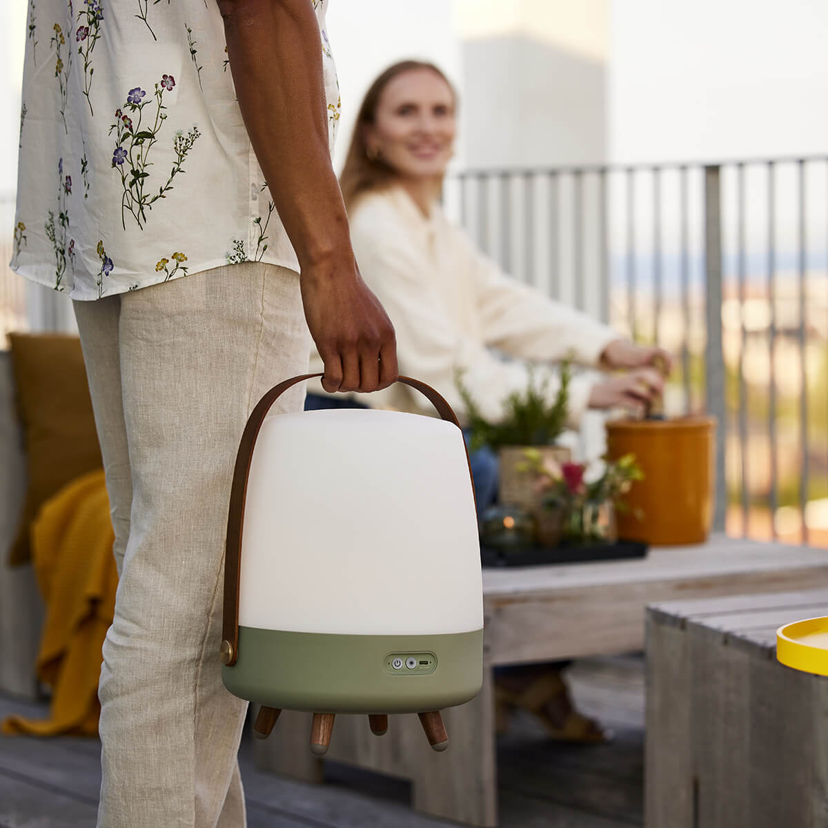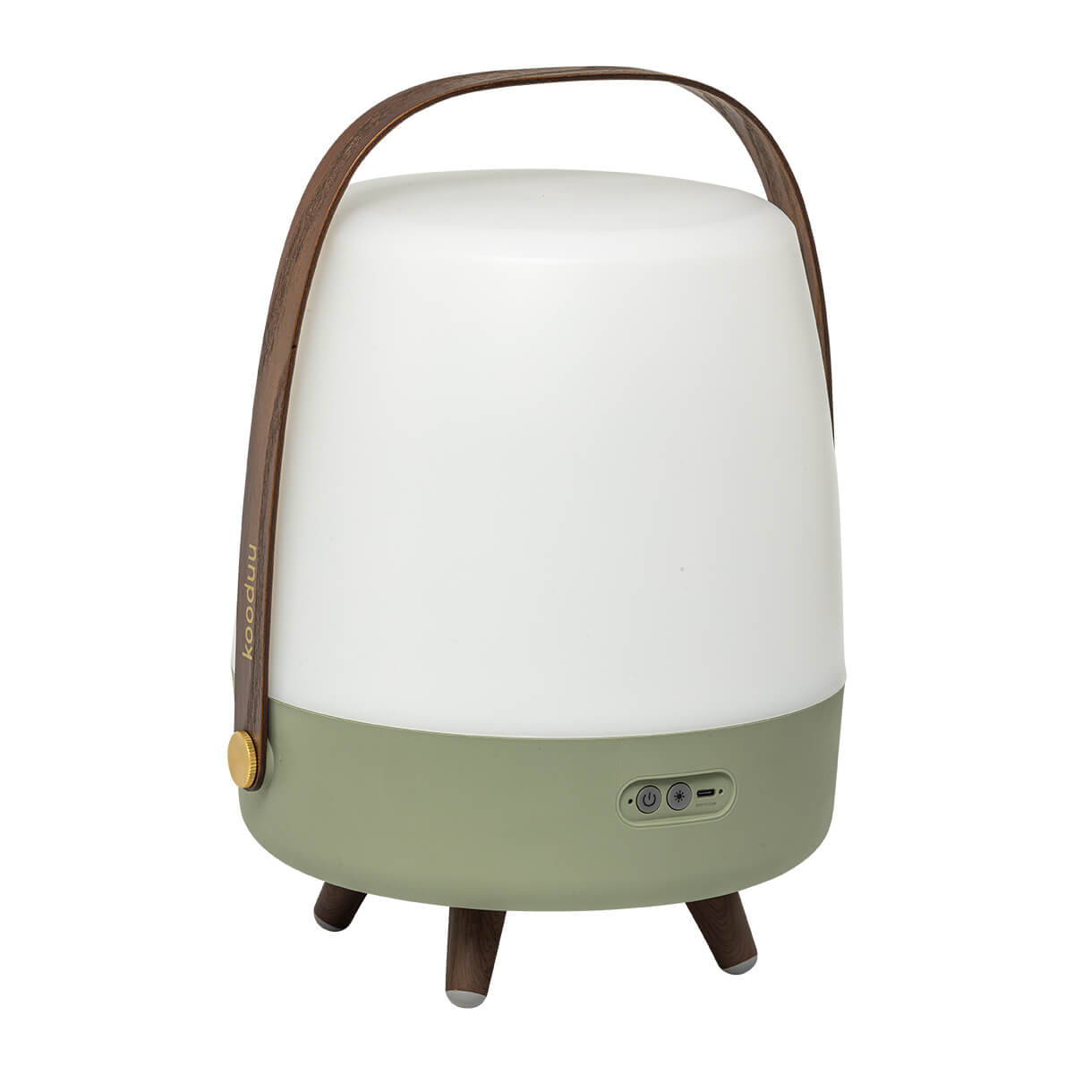 Das Design der schönen Musiklampe verknüpft nordische Eleganz mit zeitgemäßen, soften Farbnuancen. Auf diese Weise eignet sich die Lite-up Play 2.0 von Kooduu für diverse Einrichtungskonzepte. Die Farbpalette umfasst erdiges Braun, mattes Grün, dunkles Blau und einen hellen Sandton. Details wie der Messingknopf und der elegant gebogene Henkel aus Holz tragen ihr Übriges zur zeitgemäßen Designsprache bei.
