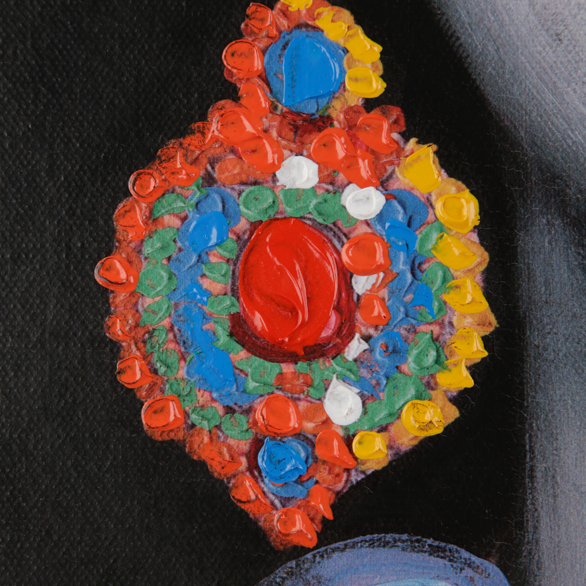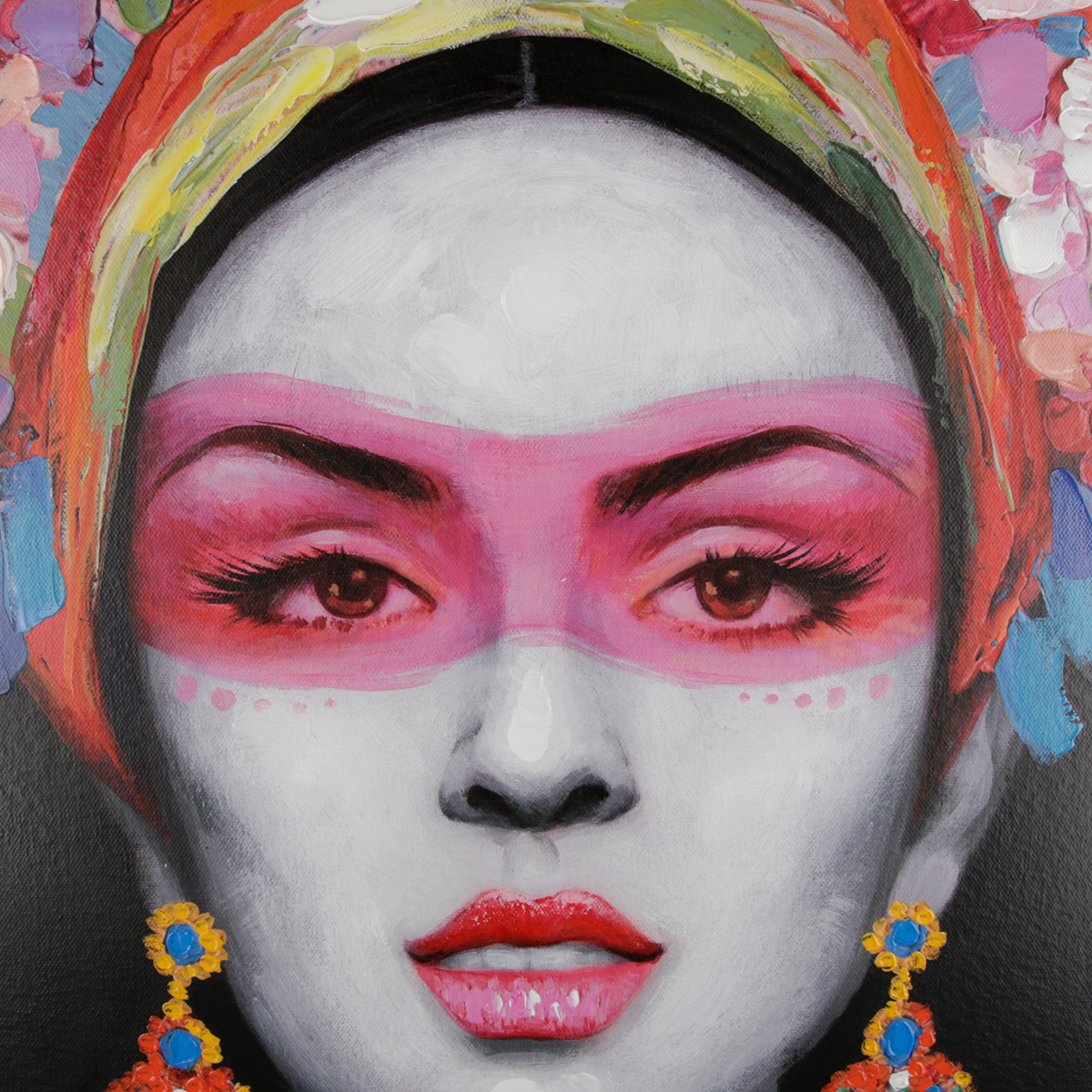- Porträt einer auffällig geschminkten Dame mit üppiger Blumenzier
