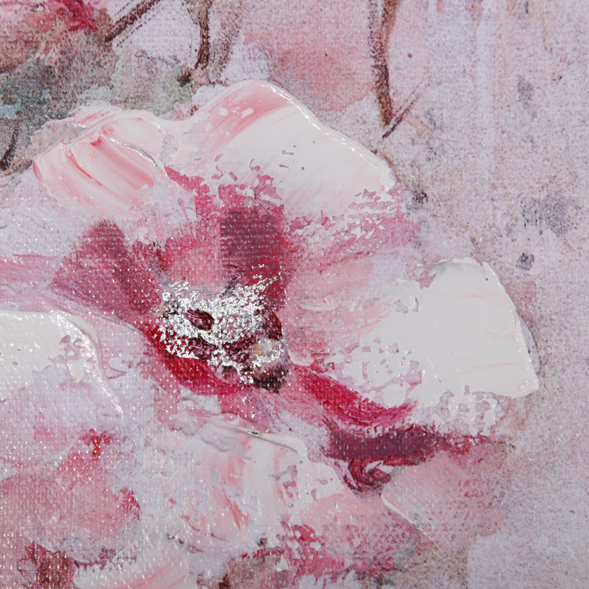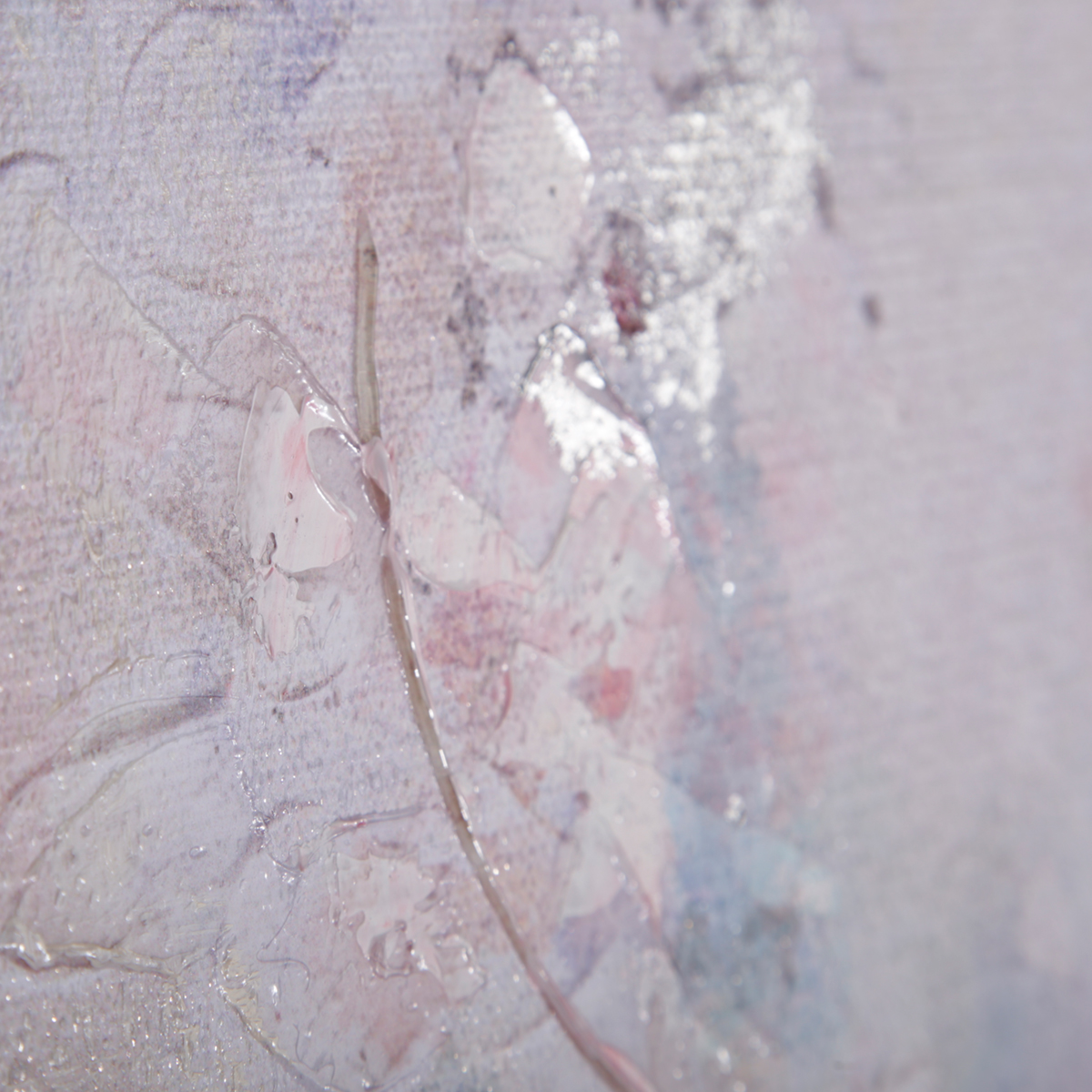Besonderen Glanz erhält das Bild durch gezielt gesetzte Highlights mit silbern glänzender Farbe. Diese harmonieren aufs Schönste mit der übrigen Farbpalette: den sanften Rosatönen und dem intensiven Pink. Unterbrochen werden diese von pastos aufgetragenen Akzenten in Weiß und aquarelliert anmutenden Flächen in Blassgrün.