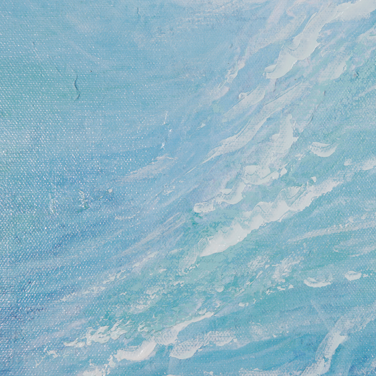 Das Wandgemälde ist in Öl auf Leinwand ausgeführt. Die Farbpalette wechselt zwischen dunklem Blau und hellblauen Tönen, die sich nach oben hin in einem blassen Weißblau verlieren. Der teils pastose Farbauftrag bringt Dynamik ins Spiel, lässt die grobe Struktur des textilen Bildträgers jedoch offenbar. In der Höhe misst das Bild 120 cm, in der Breite 90 cm.