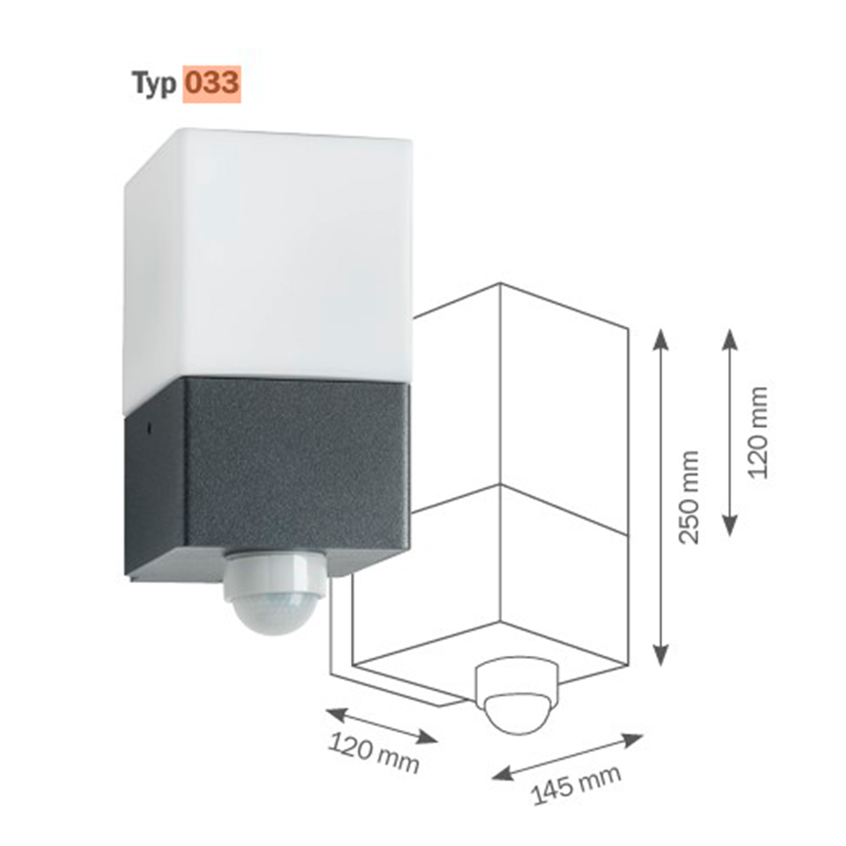 Die Ausführung mit Bewegungsmelder (außenliegend) hat folgende technische Details: Erfassungswinkel: ca. 180°, einstellbare Reichweite bis max. 8 Meter, Zeiteinstellung: ca. 10 Sek. – 8 Min.