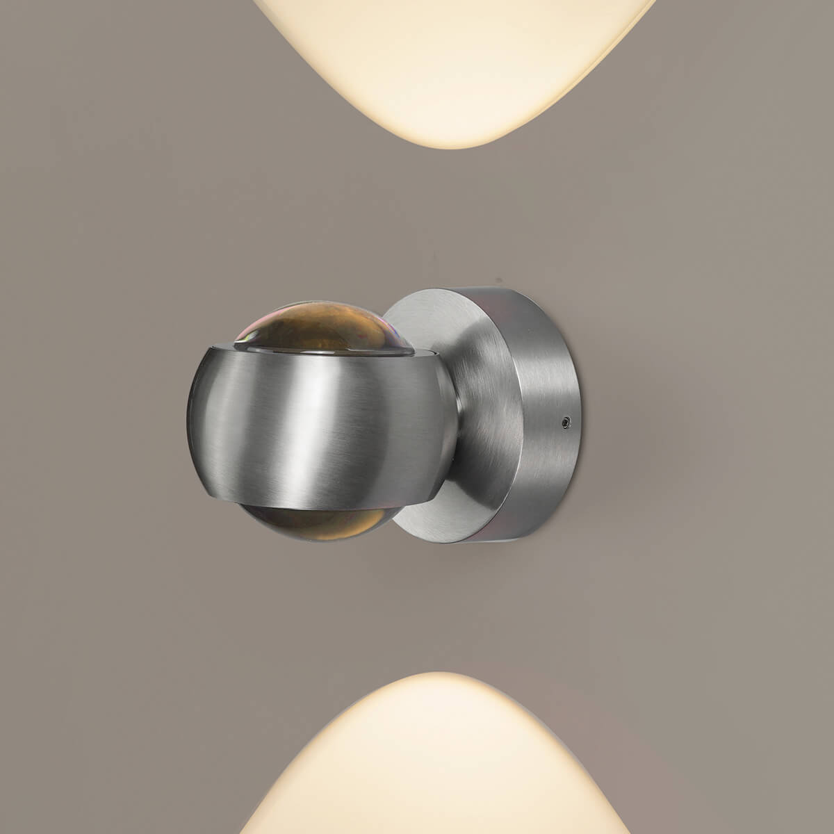 Ihr kugelförmiger Kopf mit Diffusoren aus Lupenglas erzeugt brillante, klar definierte Lichtkegel, die jede Wandgestaltung atmosphärisch unterstreichen. Ein besonderes Highlight ist die einstellbare Lichtfarbe: Je nach Stimmung oder Einsatzbereich können Sie zwischen gemütlichen 2.700 K (warmweiß), 3.200 K (neutralweiß) oder sachlichen 4.000 Kelvin (kaltweiß) wählen. Damit passt sich die Wandlampe flexibel an private Wohnhäuser ebenso wie an gewerblich genutzte Gebäude an.