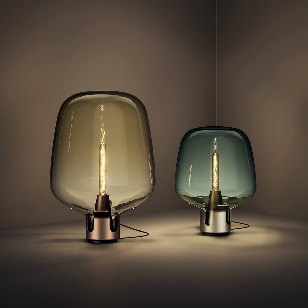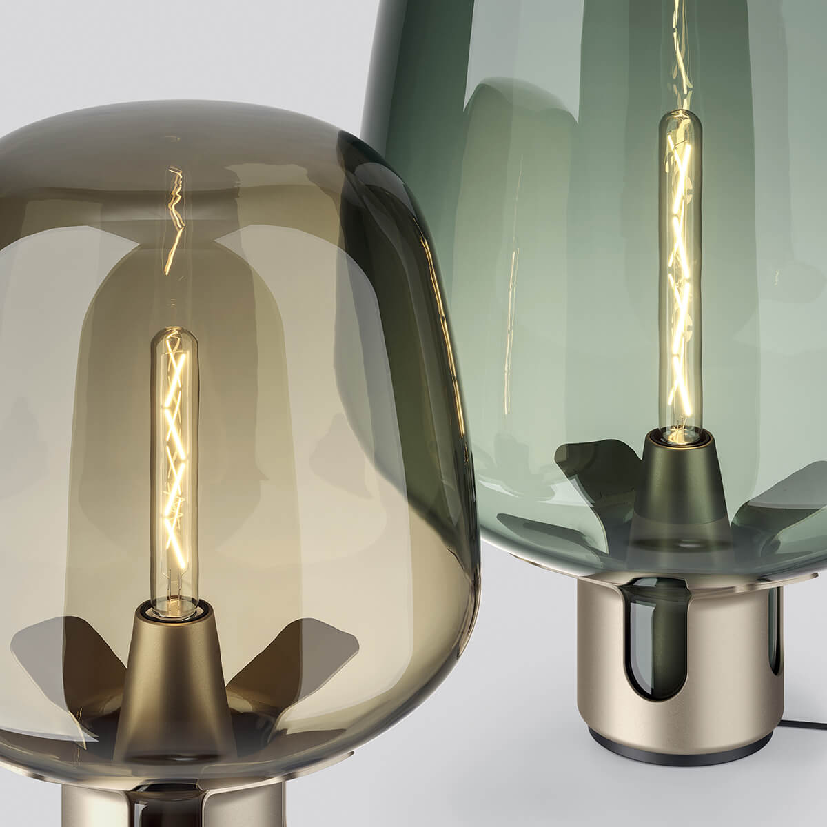 Zur Bestückung empfehlen sich röhrenförmige LED-Filamentlampen mit warmweißer Lichtfarbe, die den industriellen Look der Leuchte unterstreichen und ein heimeliges Licht erzeugen. Durch die honigfarbene bzw. türkise Tönung des mundgeblasenen Glasschirms wird das Licht gefiltert und sanft in den umliegenden Raum gestreut.