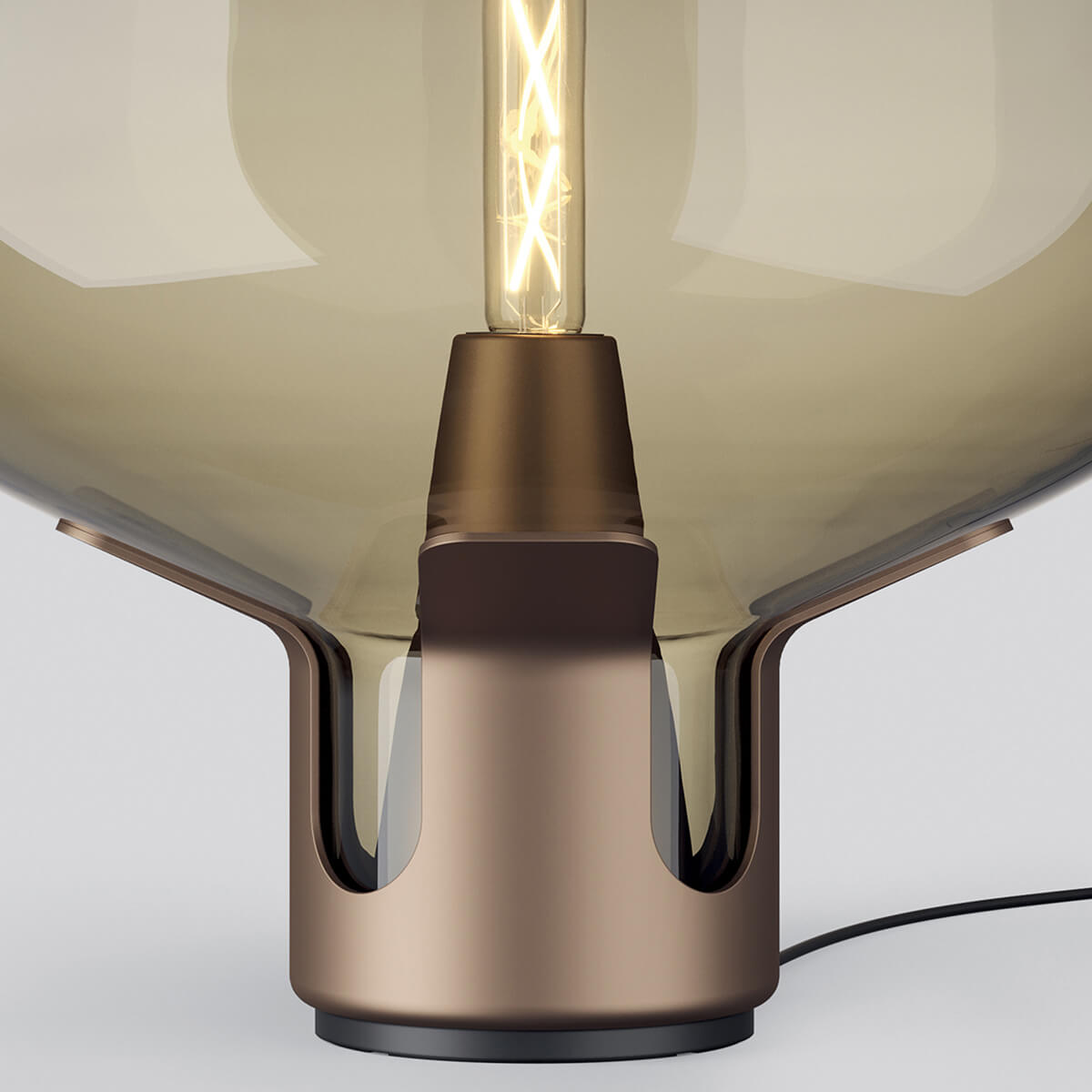 Getragen wird der voluminöse Schirm von einem Sockel in Champagner oder Braun, der wie eine geöffnete Blüte erscheint. Über einen Dimmer auf dem schwarzen Stromkabel kann das ausstrahlende Licht in seiner Helligkeit reguliert werden.