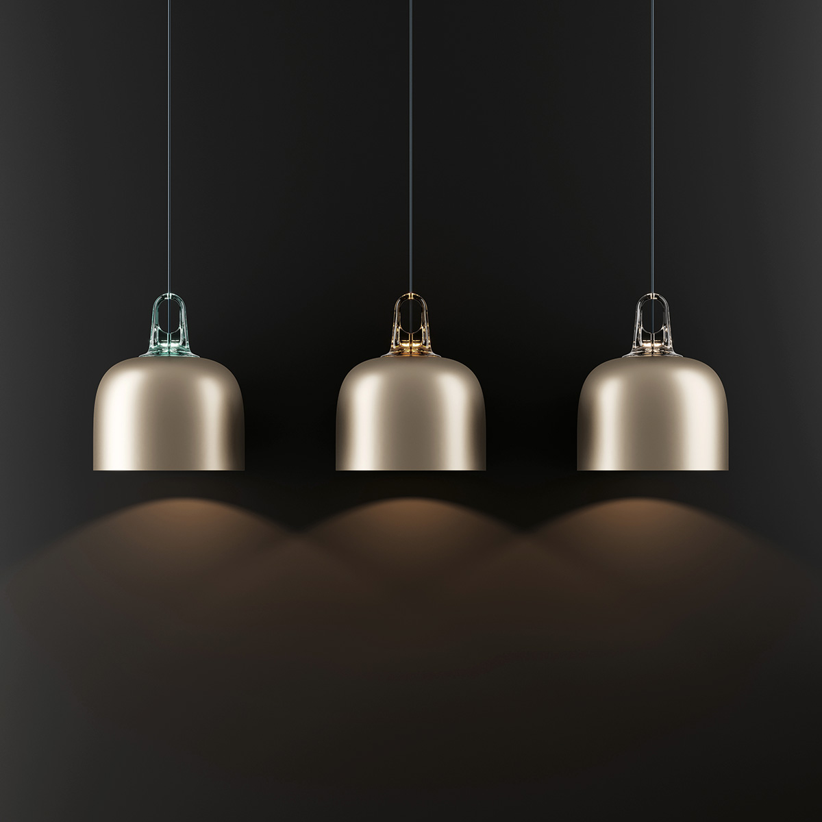 Die Lodes Jim Bell Pendelleuchte wird mit einem weißen Baldachin geliefert. Ausführungen mit einem Baldachin in Schwarz matt, Bronze matt, Chrom oder Champagner matt sind auf Anfrage erhältlich.
