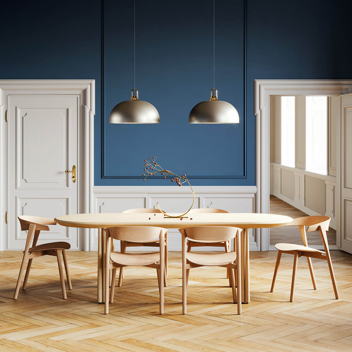 Die Lodes Jim Dome Pendelleuchte wird mit einem weißen Baldachin geliefert. Ausführungen mit einem Baldachin in Schwarz matt, Bronze matt, Chrom oder Champagner matt sind auf Anfrage erhältlich.