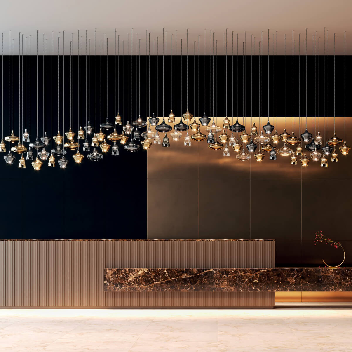 Trotz ihrer kompakten Größe entfaltet die Small-Version eine bemerkenswerte Wirkung. Sie eignet sich ideal als stilvolle Pendellampe über kleinen runden Esstischen, als dezente Lichtquelle über einem Beistelltisch oder als raffinierte Akzentbeleuchtung im Schlafzimmer. In linearen Gruppen über einer Theke oder als harmonisches Cluster arrangiert, entstehen beeindruckende Lichtkompositionen, die Räumen Tiefe und Eleganz verleihen.