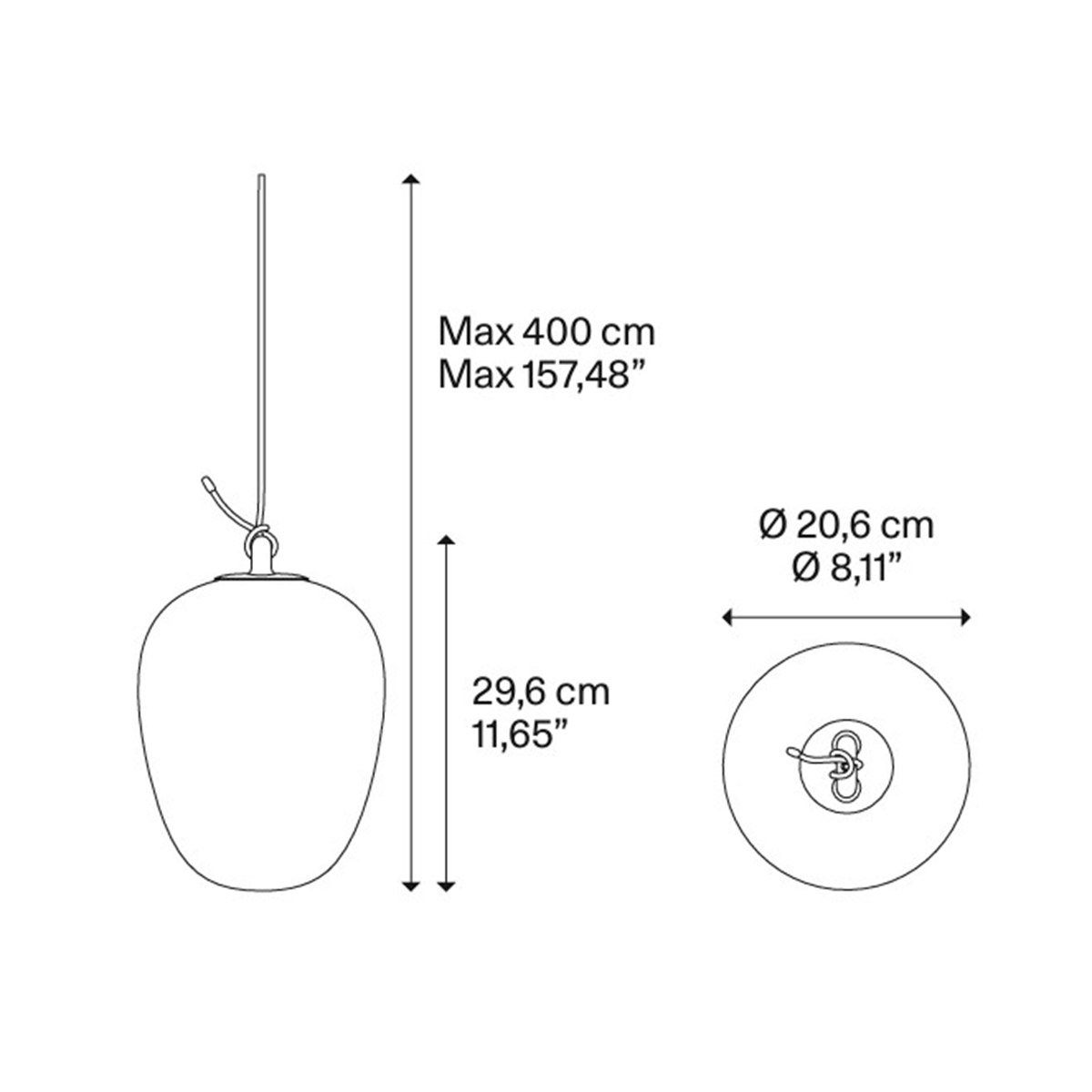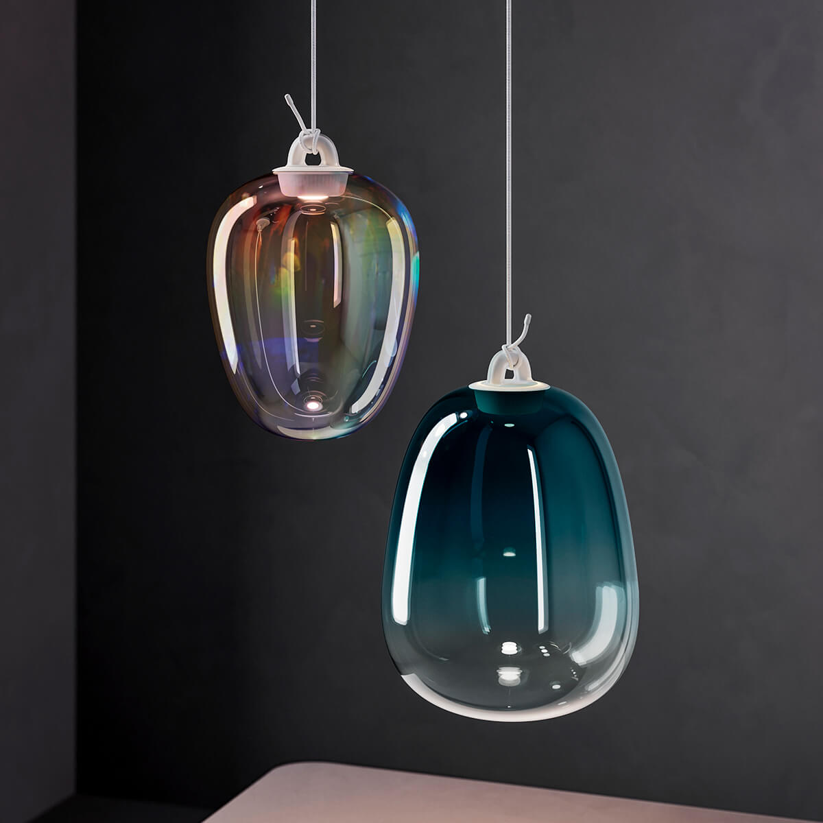 - Mit einer Glas Medium LED Pendelleuchte in jeweils der ausgewählten Glasfarbe mit einem weißen runden Baldachin ausgestattet