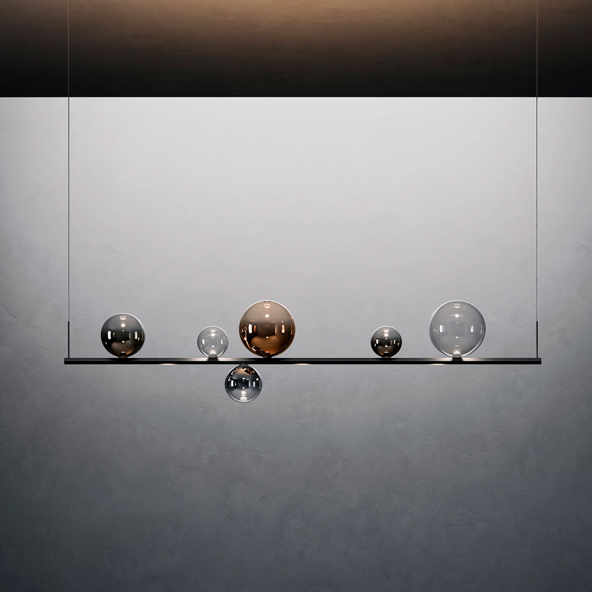 Die Random Stick LED Pendelleuchte von Lodes, entworfen von Chia-Ying Lee, verbindet minimalistisches Design mit dekorativer Eleganz zu einer Leuchte, die Kunst und Funktion eindrucksvoll vereint. Inspiriert von der Leichtigkeit schwebender Seifenblasen, treffen perfekt geformte Kugeln aus mundgeblasenem Glas auf einen markanten, sechseckigen Metallstab - ein harmonisches Zusammenspiel von Geometrie und Poesie.