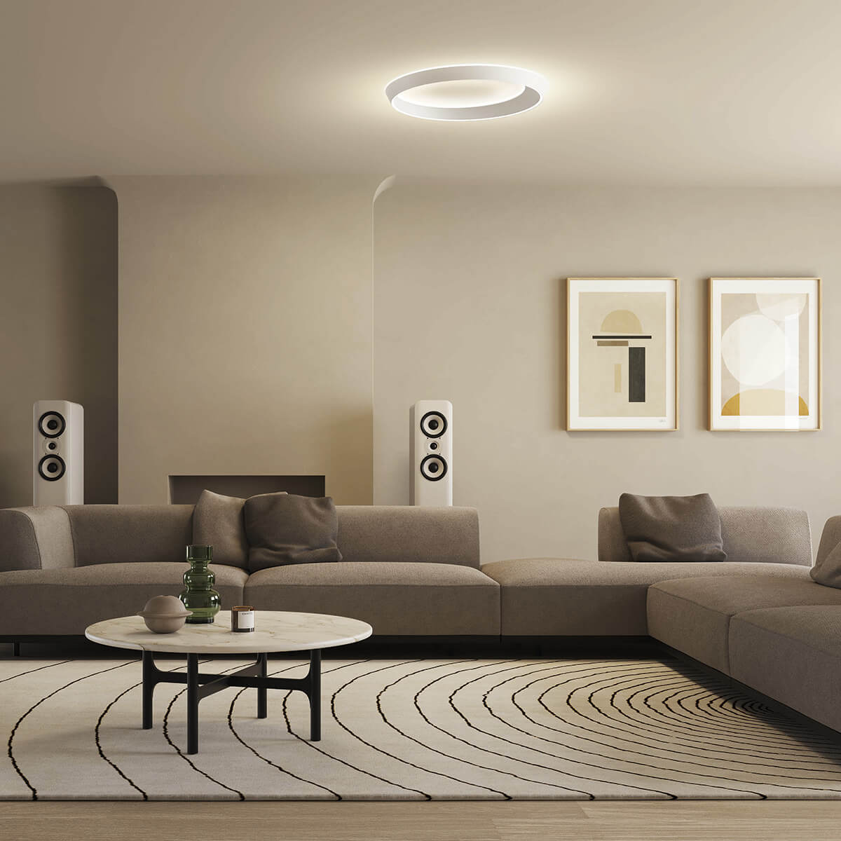 Die Tidal 75 LED Deckenleuchte von Lodes bringt die faszinierende Dynamik von Himmelskörpern und Gezeiten in Ihr Interieur. Mit ihrer beeindruckenden Größe von 75 cm und der asymmetrischen Ringform wird sie zum markanten Blickfang in großzügigen Wohn- und Geschäftsräumen. Je nach Perspektive verändert sich die Wirkung der Leuchte, da eine Seite des Rings breiter gestaltet ist als die andere – ein Spiel von Balance, Bewegung und Eleganz.
