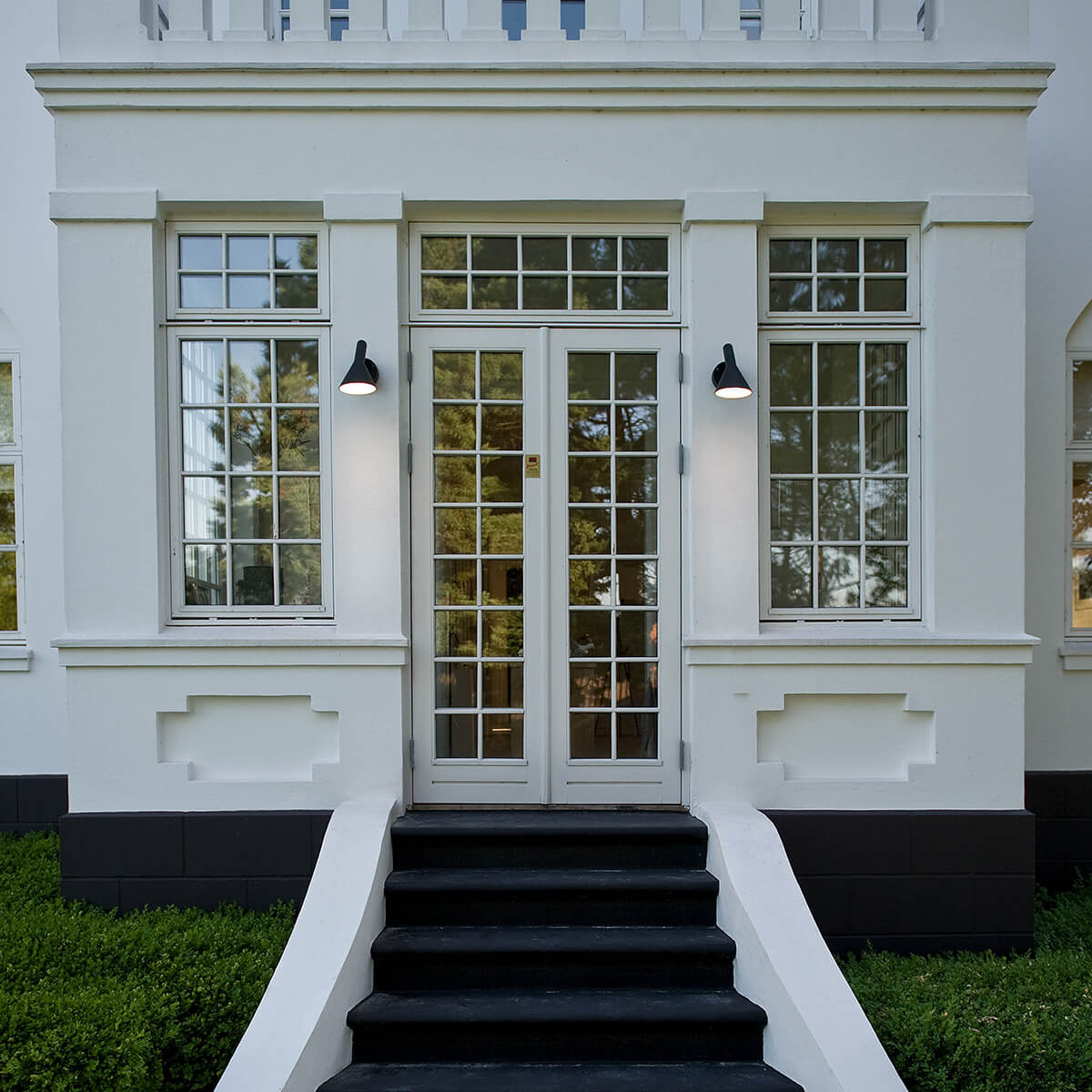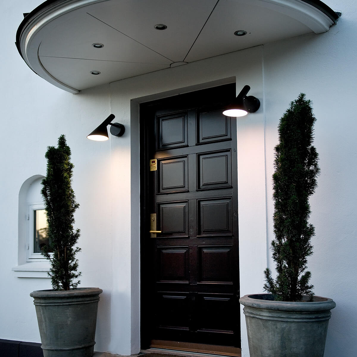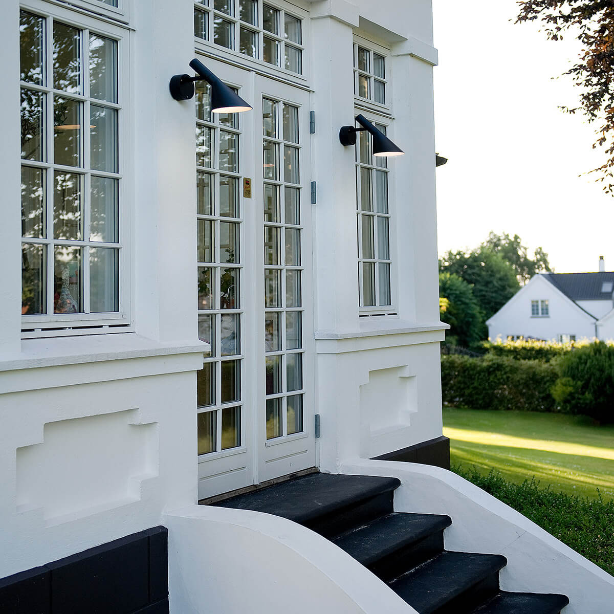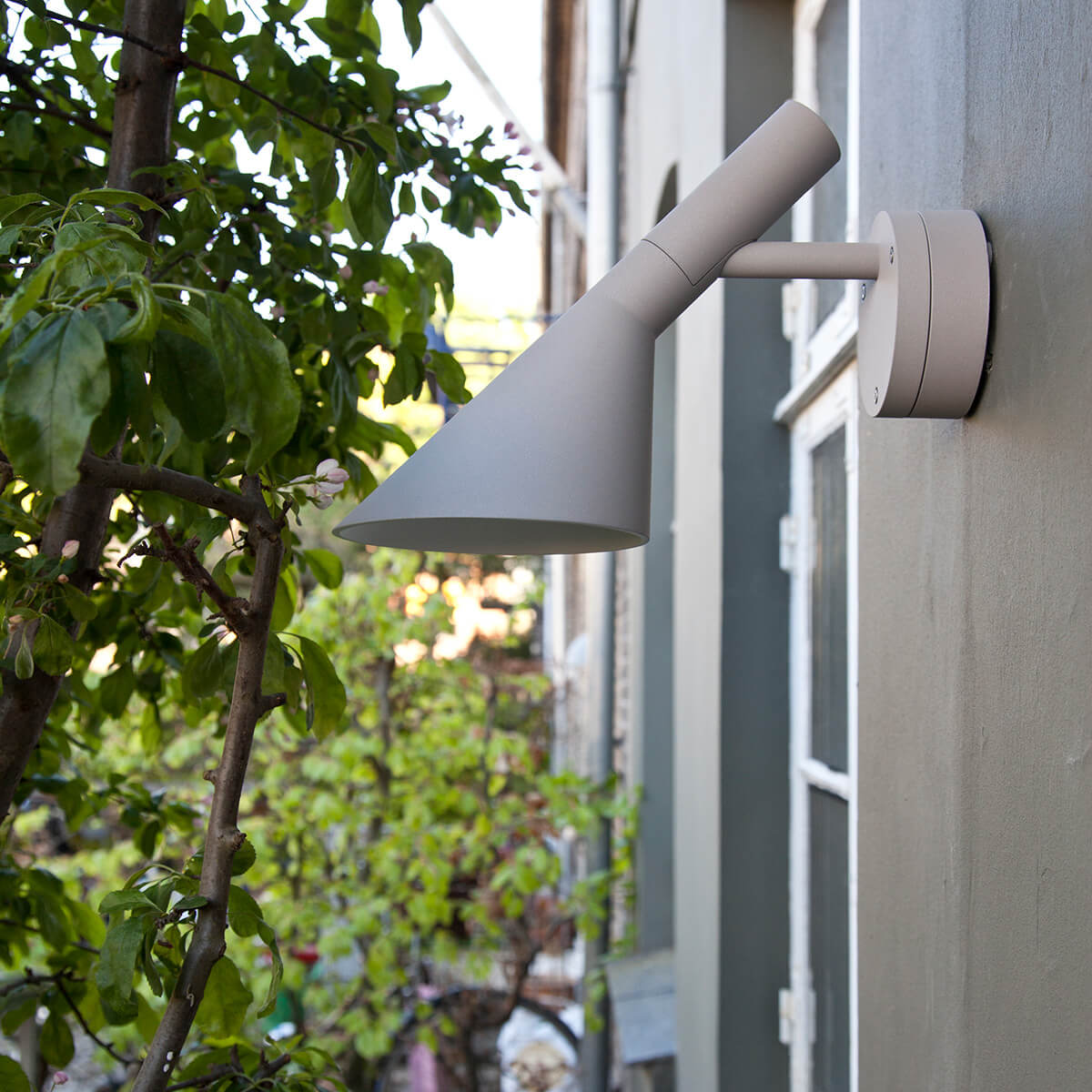 Auf Basis der Designprinzipien von Arne Jacobsen entstand eine Wandlampe für den Außenbereich, die sich mit ihrer sachlich gestalteten Form vor allem zur Beleuchtung moderner Architekturen eignet. Die Leuchte strahlt ein angenehmes, nach unten gerichtetes Licht ab. Die weiß lackierte Innenseite des Schirms sorgt für mehr Weichheit und eine bessere Lichtabstrahlung.