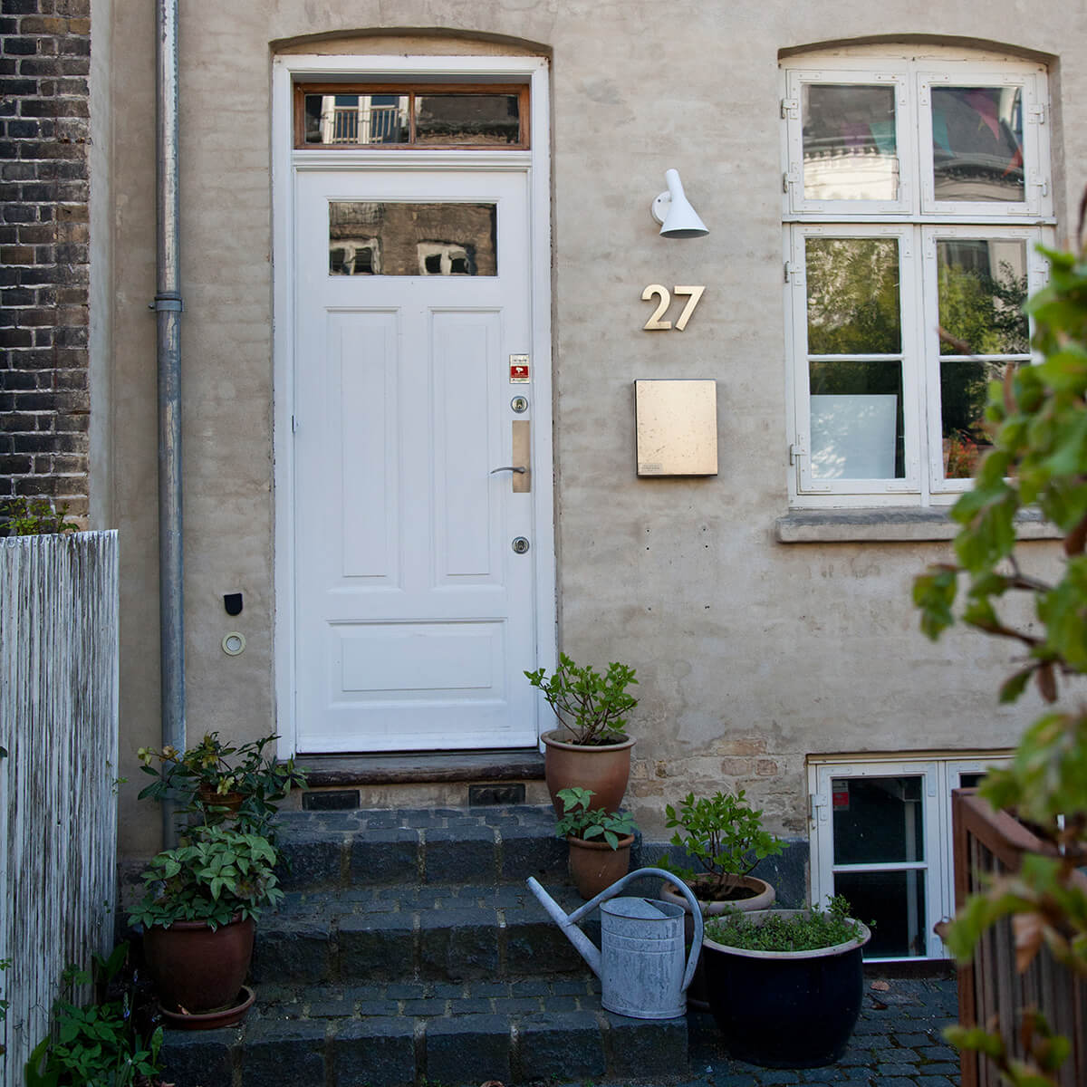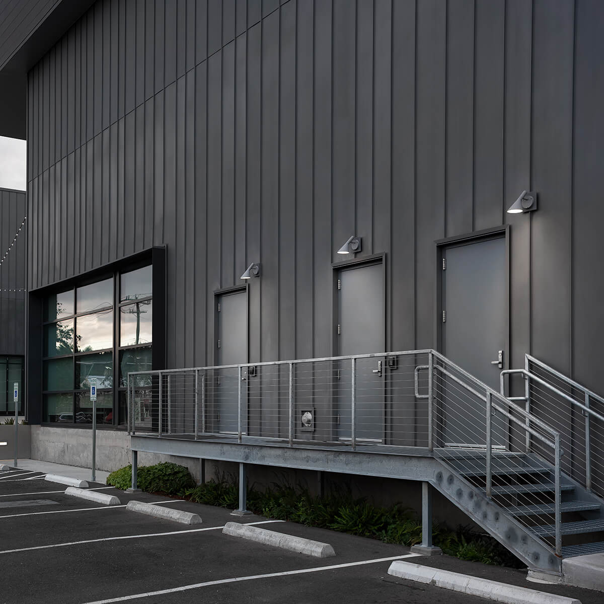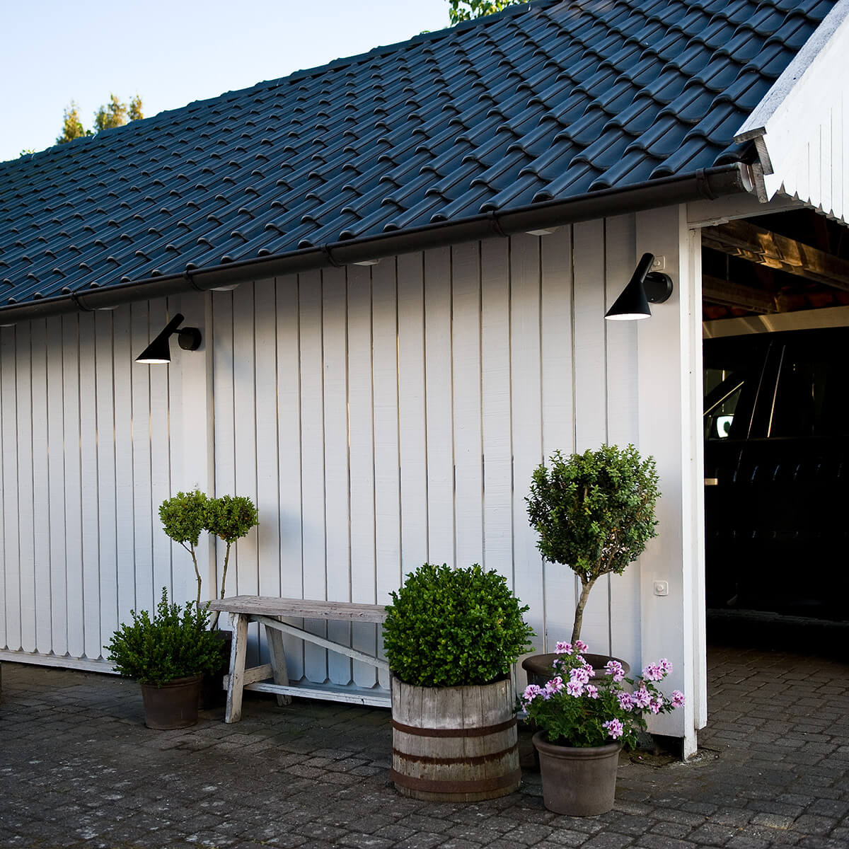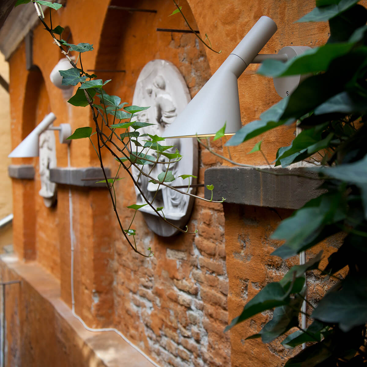Auf Basis der Designprinzipien von Arne Jacobsen entstand eine Wandlampe für den Außenbereich, die sich mit ihrer sachlich gestalteten Form vor allem zur Beleuchtung moderner Architekturen eignet. Die Leuchte strahlt ein angenehmes, nach unten gerichtetes Licht ab. Die weiß lackierte Innenseite des Schirms sorgt für mehr Weichheit und eine bessere Lichtabstrahlung.