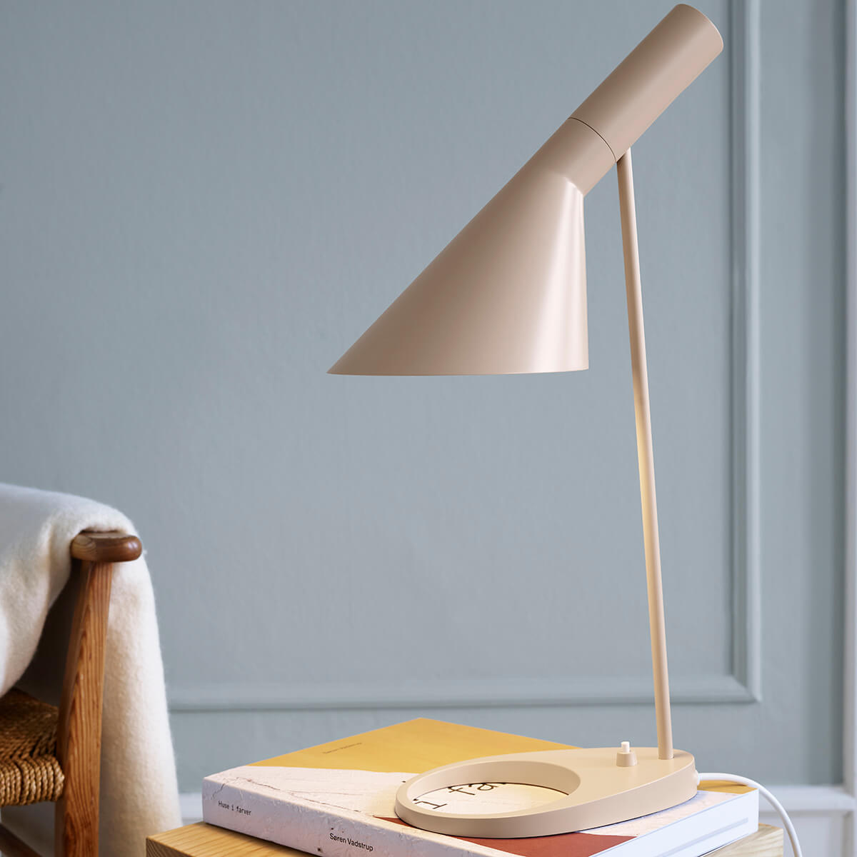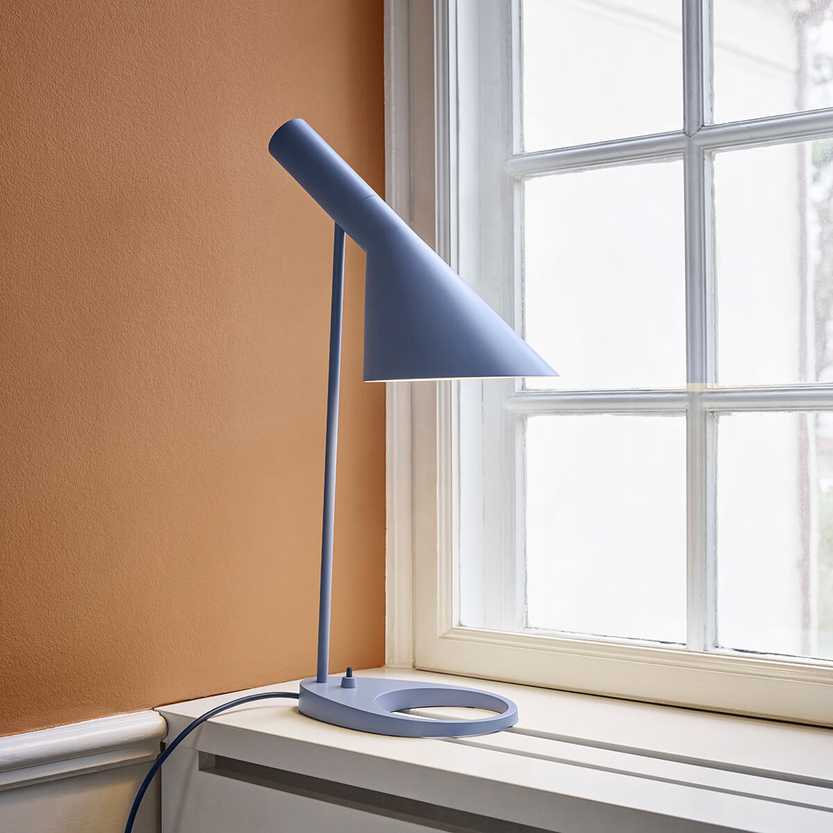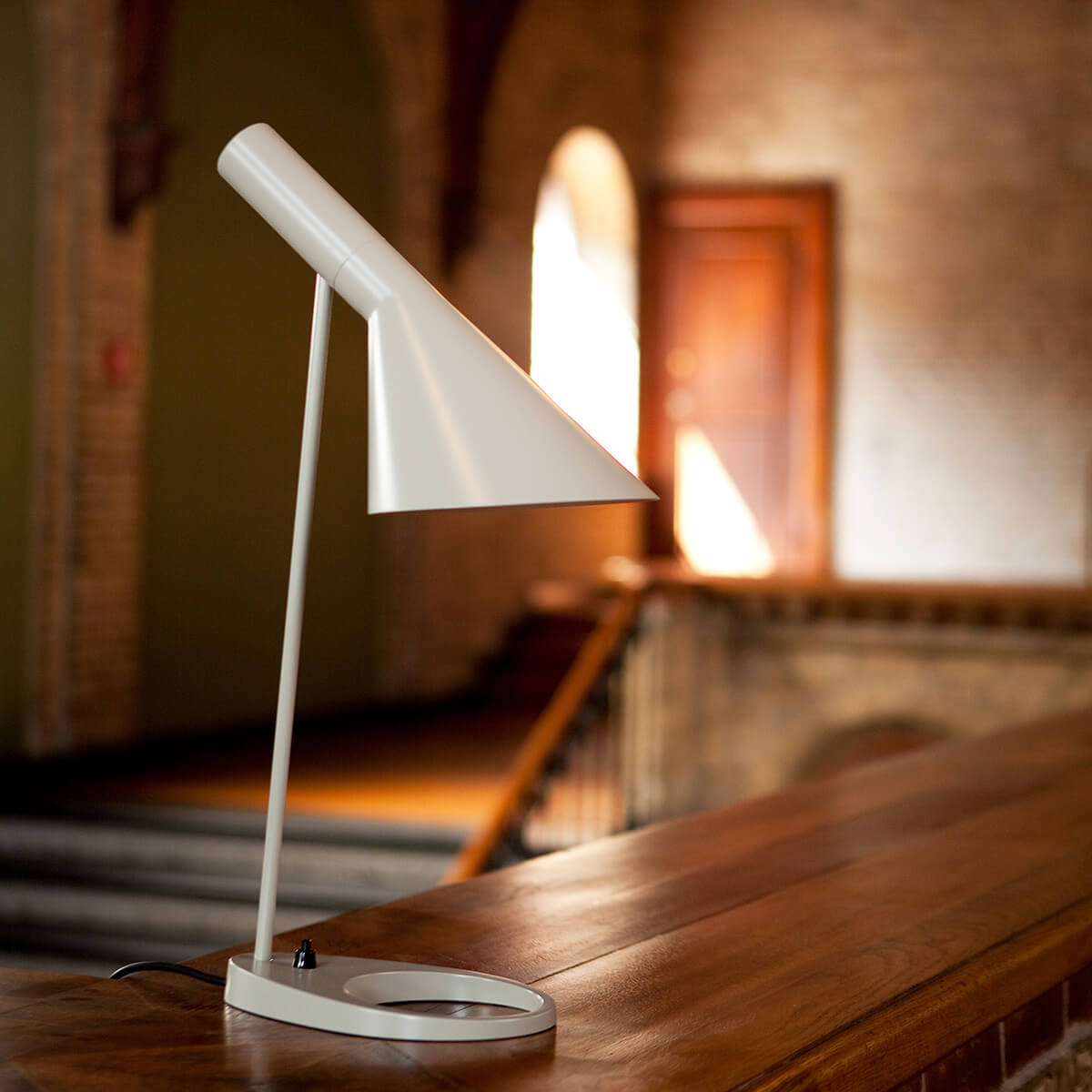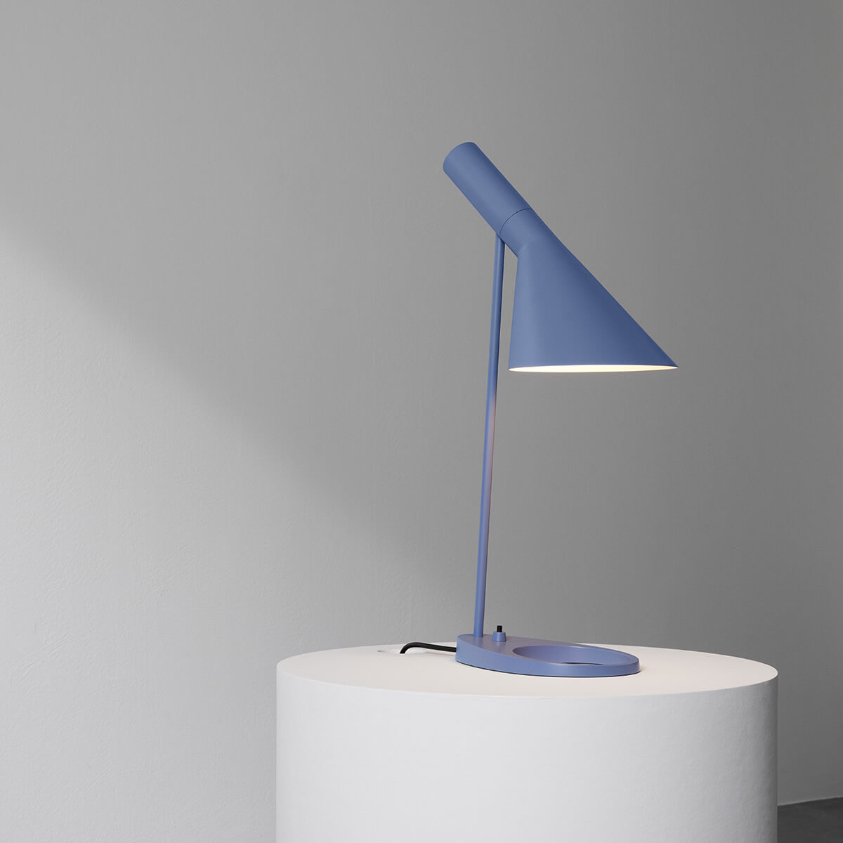 Prägnantes Gestaltungsmerkmal der AJ ist der schwenkbare Leuchtenkopf, der in seiner Form die geometrischen Körper von Zylinder und Kegel miteinander vereint. Indem er das Licht richtungsbestimmt bündelt, erzeugt er eine direkte und blendfreie Lichtausstrahlung, deren Richtung sich – der Schwenkbarkeit sei Dank – noch optimieren lässt.