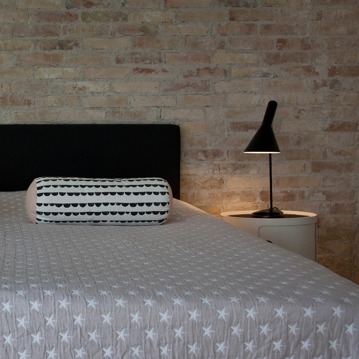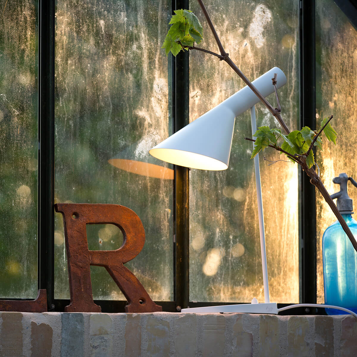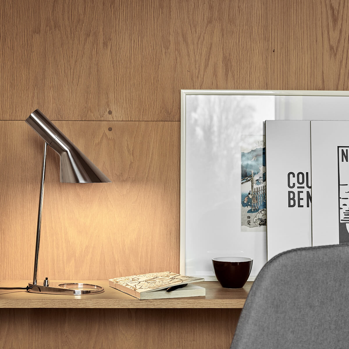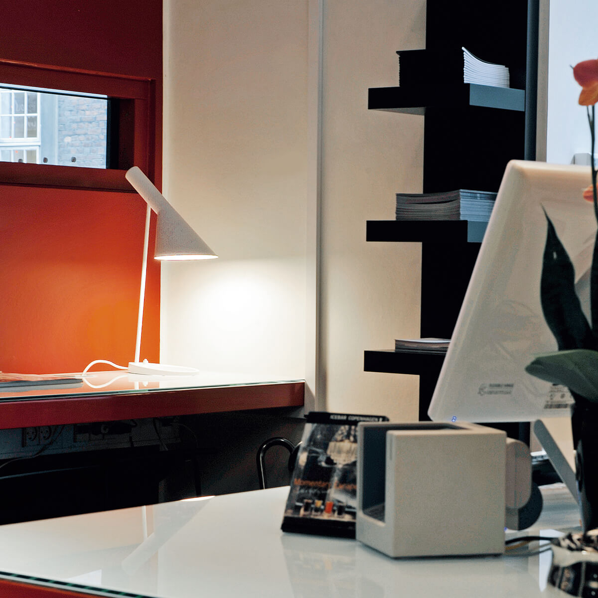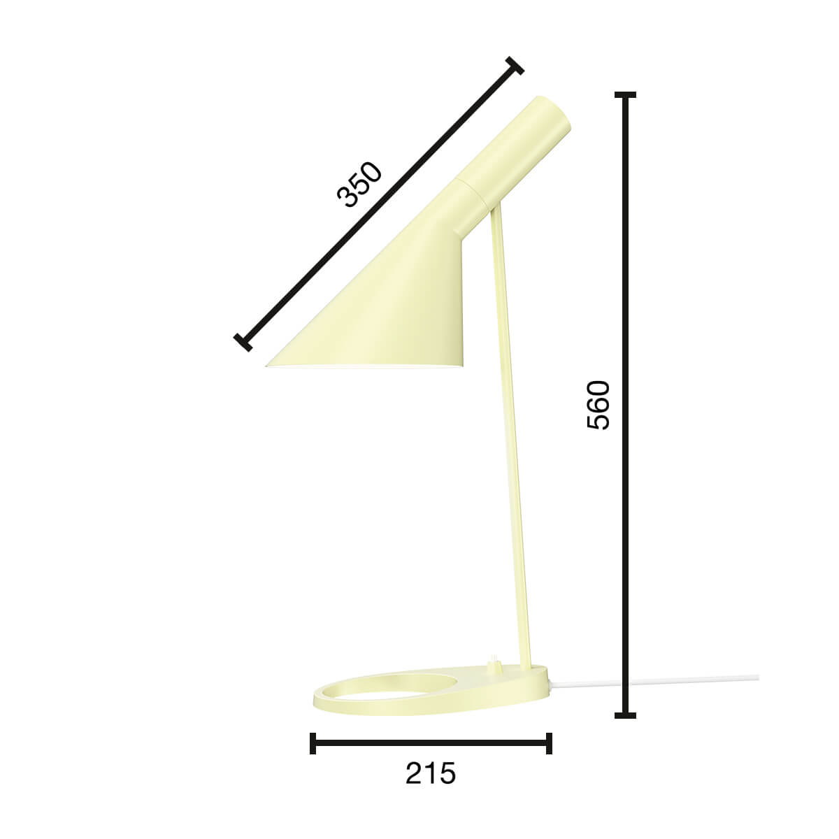 Prägnantes Gestaltungsmerkmal der AJ ist der schwenkbare Leuchtenkopf, der in seiner Form die geometrischen Körper von Zylinder und Kegel miteinander vereint. Indem er das Licht richtungsbestimmt bündelt, erzeugt er eine direkte und blendfreie Lichtausstrahlung, deren Richtung sich – der Schwenkbarkeit sei Dank – noch optimieren lässt.