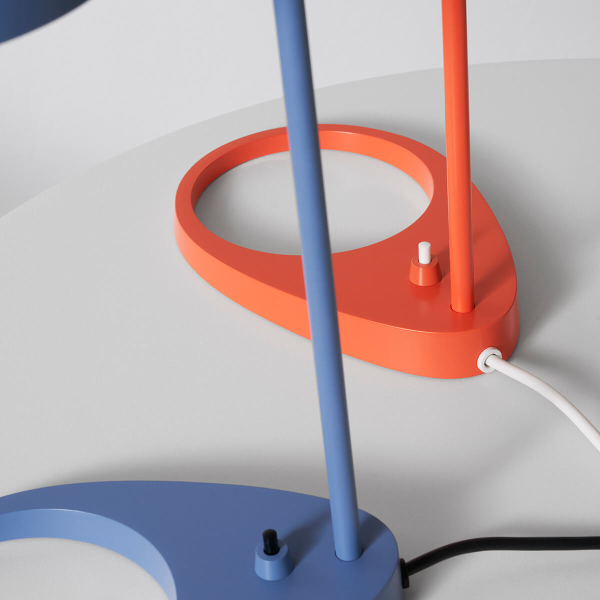 Betätigt wird die Lampe über einen Schalter am Leuchtenfuß. Mit seiner ungewöhnlichen Form, der kreisförmigen Öffnung inmitten einer zunehmenden Struktur, trägt dieser zur einzigartigen Designsprache der Tischleuchte bei. Gefertigt ist der Leuchtenfuß aus Zinkdruckguss. Der Schirm besteht aus gezogenem Stahl und ist zum Zweck einer bestmöglichen Lichtdiffusion an seiner Innenseite weiß lackiert.