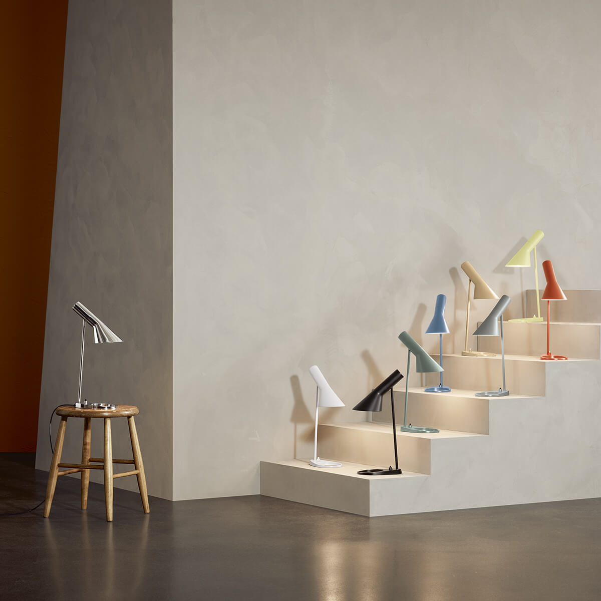 Erhältlich ist die AJ in klassischen Tönen sowie softe, pastellig anmutenden Farbnuancen. Letztere wurden zusammen mit der Designerin und Farbspezialistin Clara von Zweigbergk konzipiert und orientieren sich an Aquarellen von Arne Jacobsen selbst. Besonders modernistisch wird es mit der Version aus poliertem Edelstahl. Diese entspricht einer Variante der Originalversion, die ebenfalls aus glänzendem Edelstahl beschaffen war und das Umgebungslicht auf eindrucksvolle Weise spiegelte.