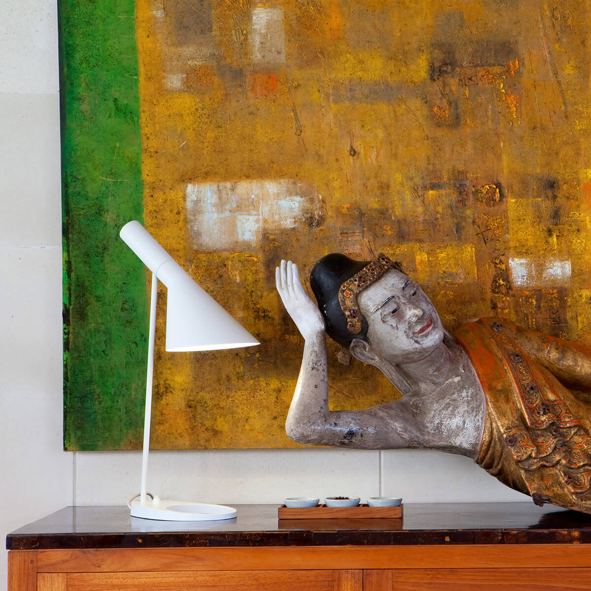Dies macht die AJ Tischleuchte zu einer vielseitig einsetzbaren Beleuchtungsquelle: Die Leuchte eignet sich als Leselampe ebenso wie zur Arbeitsplatzbeleuchtung und macht auch auf Sideboards und Kommoden eine gute Figur. Die handliche Größe und die leichte Konstruktion erleichtern es zudem, die Tischleuchte von Louis Poulsen nach Belieben zu verschieben.
