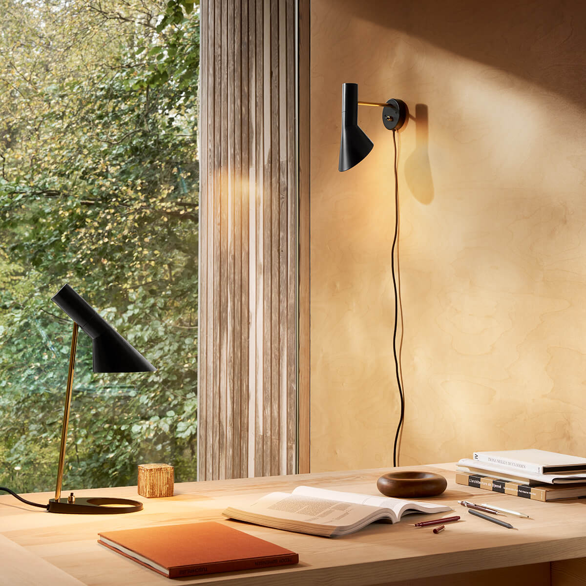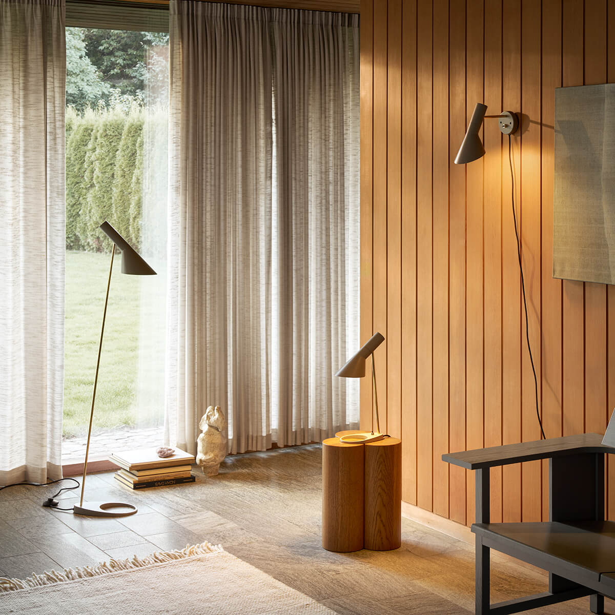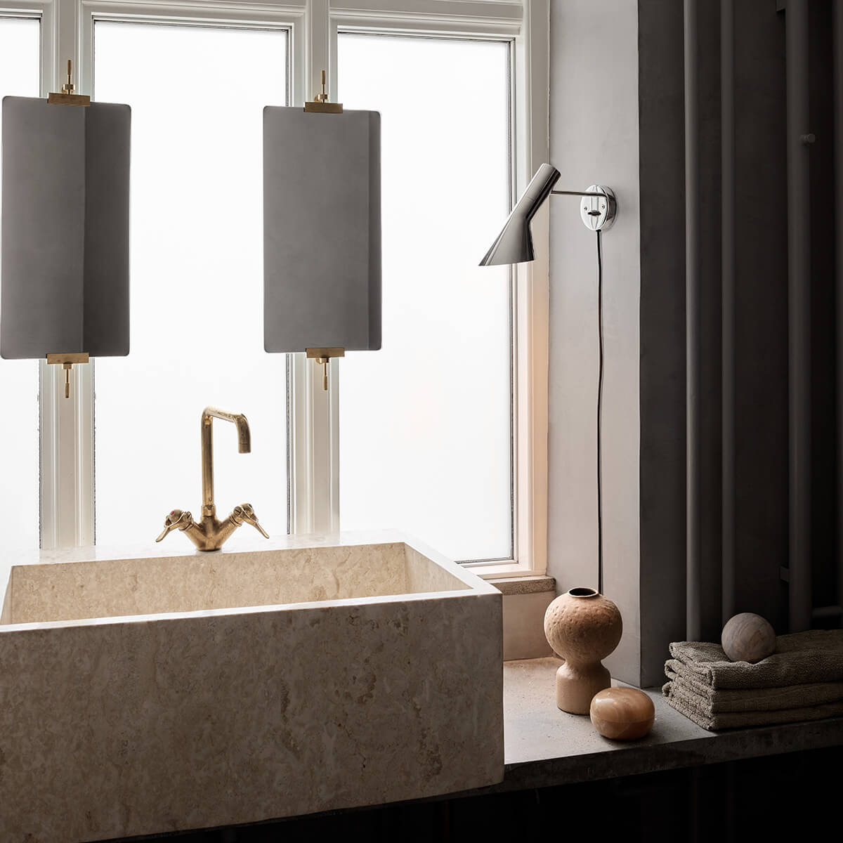 Wer es stilvoller mag, wird unter den Leuchten aus glanzvollem Edelstahl und poliertem Messing sein Lieblingsmodell finden. Die Edelstahl-Version nimmt Bezug auf das Originaldesign von Arne Jacobsen. Die Varianten mit Schaft und Knopf aus unbehandeltem Messing wiederum, kombiniert mit Schirmen in Warm grey und Schwarz, verleihen der AJ Wandleuchte eine aparte Note und machen sie vor allem in repräsentativen Raumkonzepten zum Blickfang.