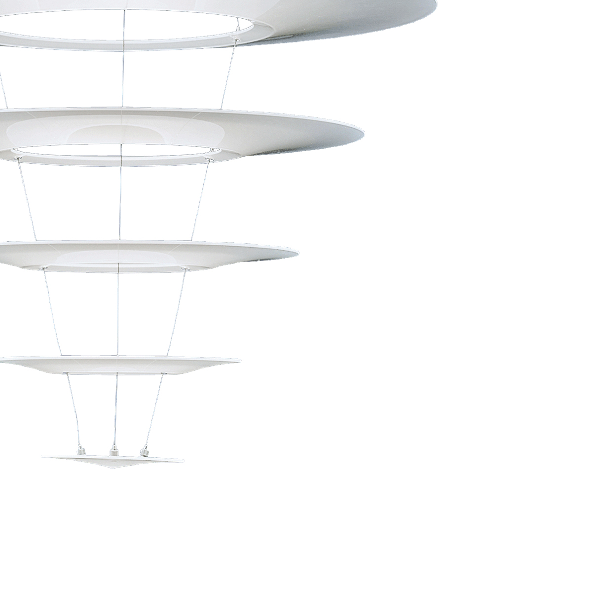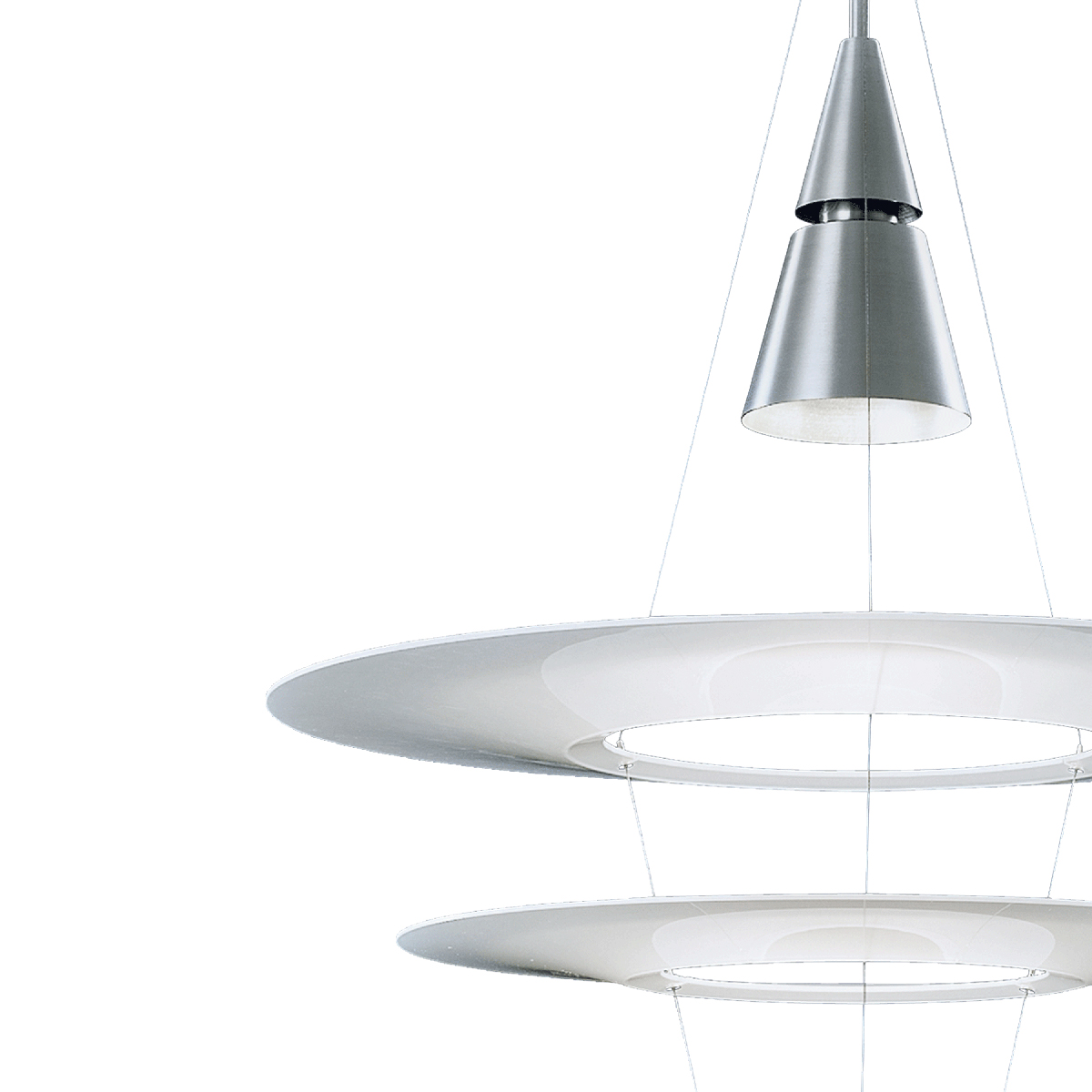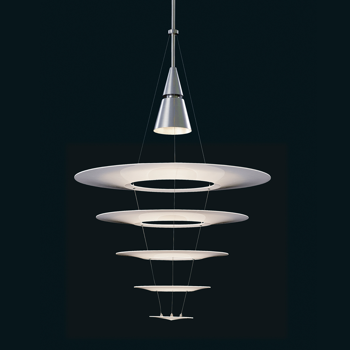 Die Enigma 545 Pendelleuchte, eine Produktkreation des japanischen Designers Shoichi Uchiyama, überrascht durch ihre ungewöhnliche Leichtigkeit und Transparenz. Ausgelöst wird dieser Eindruck durch die übereinander angeordneten Leuchtenschirme, die scheinbar schwerelos und frei unter der Lichtquelle schweben. Dass die aus Acryl gefertigten Schirmsegmente an zarten Edelstahlseilen befestigt sind, erkennt der Betrachter erst auf den zweiten Blick.