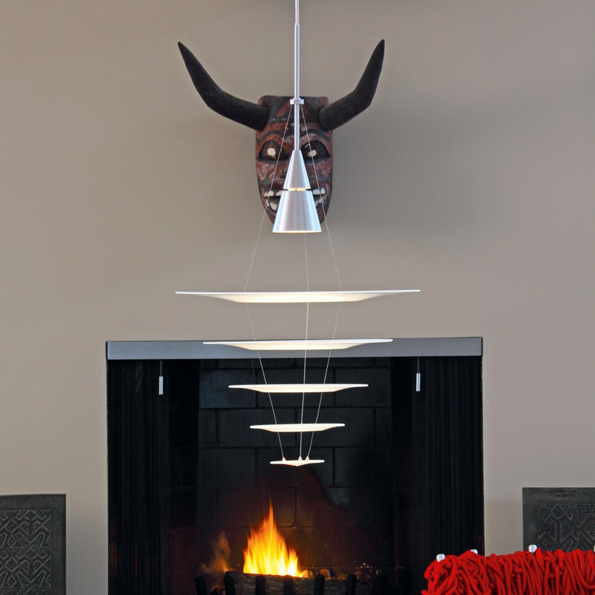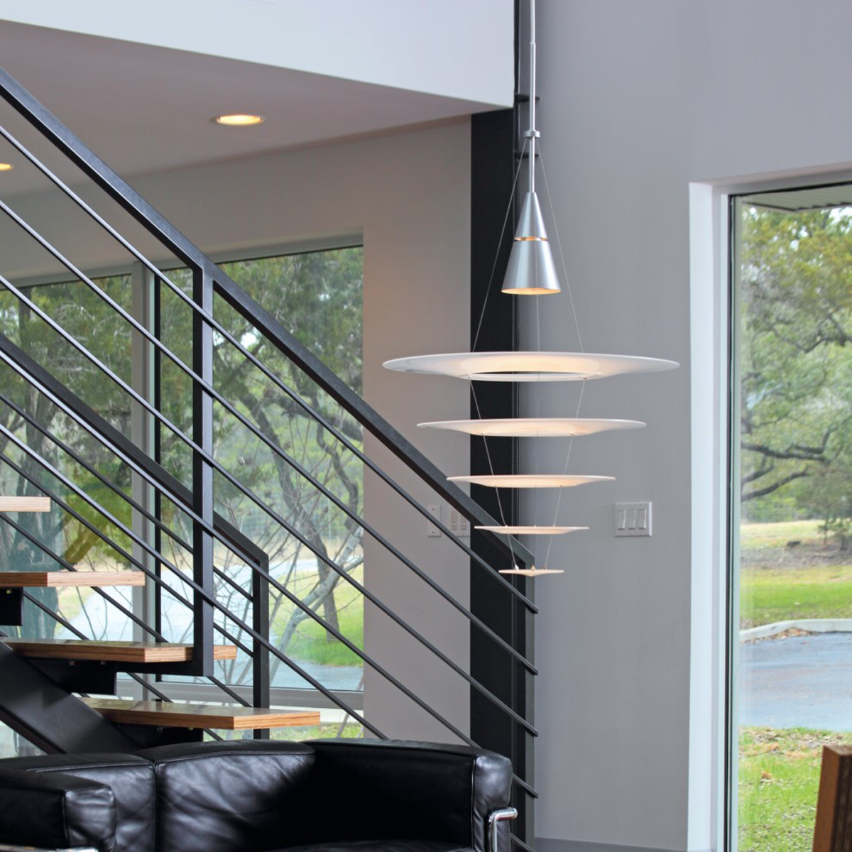 Auf diese Weise wird das Licht der Enigma 545 Pendellampe auch zu den Seiten hin verteilt, ohne dabei störende Blendeffekte zu erzeugen. Der über den Diffusorscheiben schwebende Metallkegel, der das Leuchtmittel birgt, ist ebenso wie das Pendelrohr aus gebürstetem oder schwarz lackiertem Aluminium gefertigt.