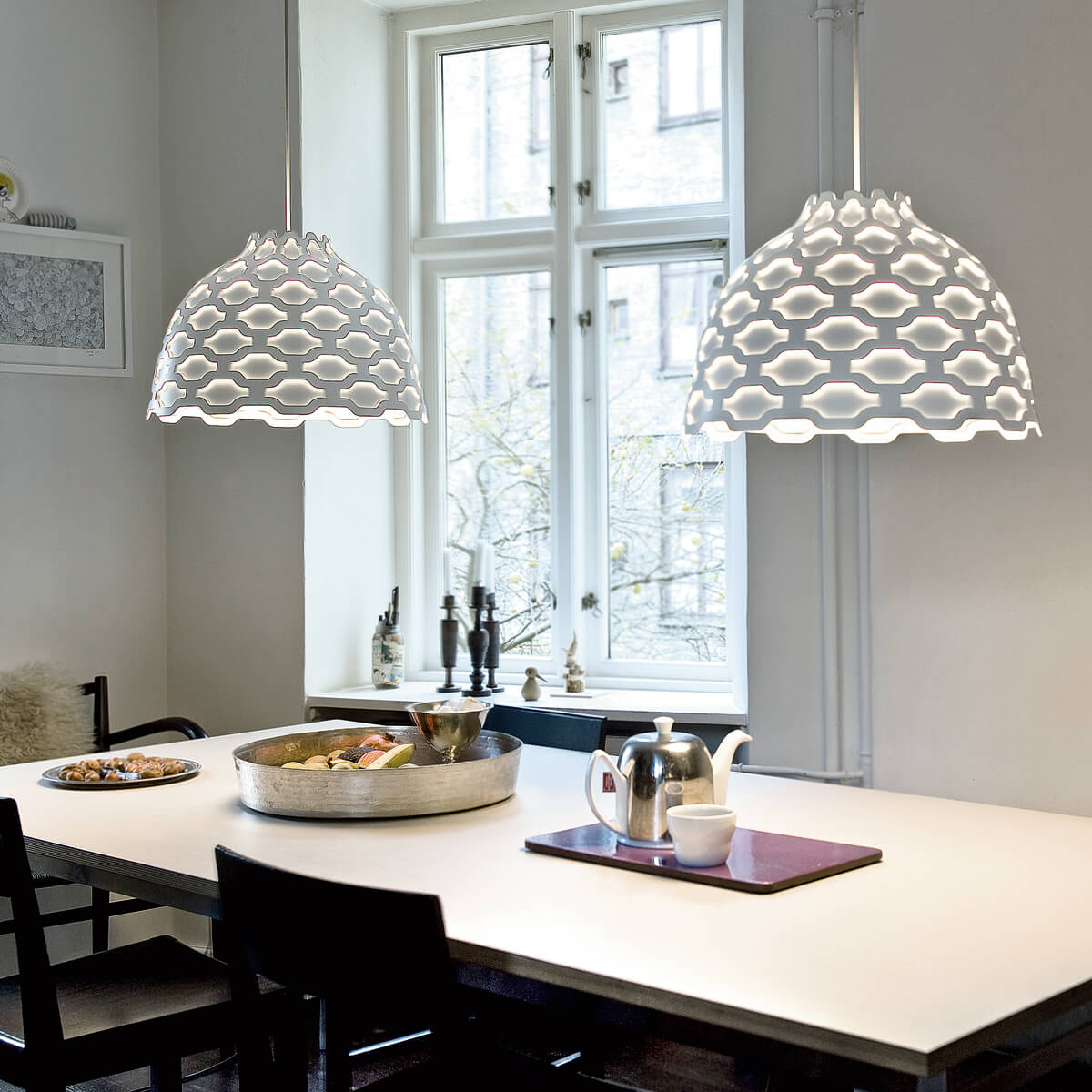 Dieses dekorative Prinzip wurde bei der Louis Poulsen LC Shutters auf den sanft gewölbten Leuchtenschirm übertragen. Ein gleichmäßiges Muster zarter Öffnungen, die auf handwerklich innovative Art aus dem Material gestanzt wurden, überzieht die Pendellampe und bewirkt zusätzlich zur direkten Lichtausstrahlung einen reizvollen Lichteffekt.