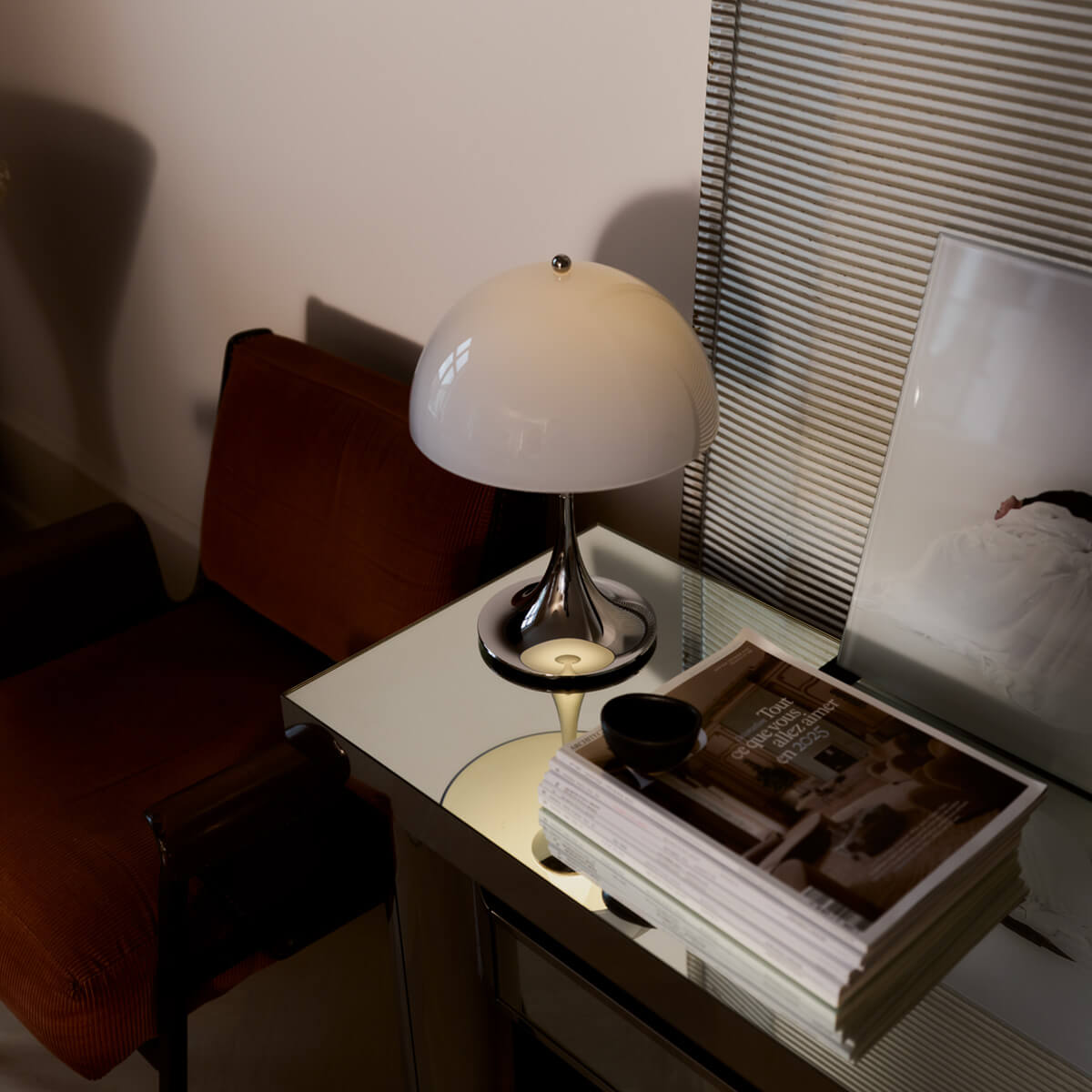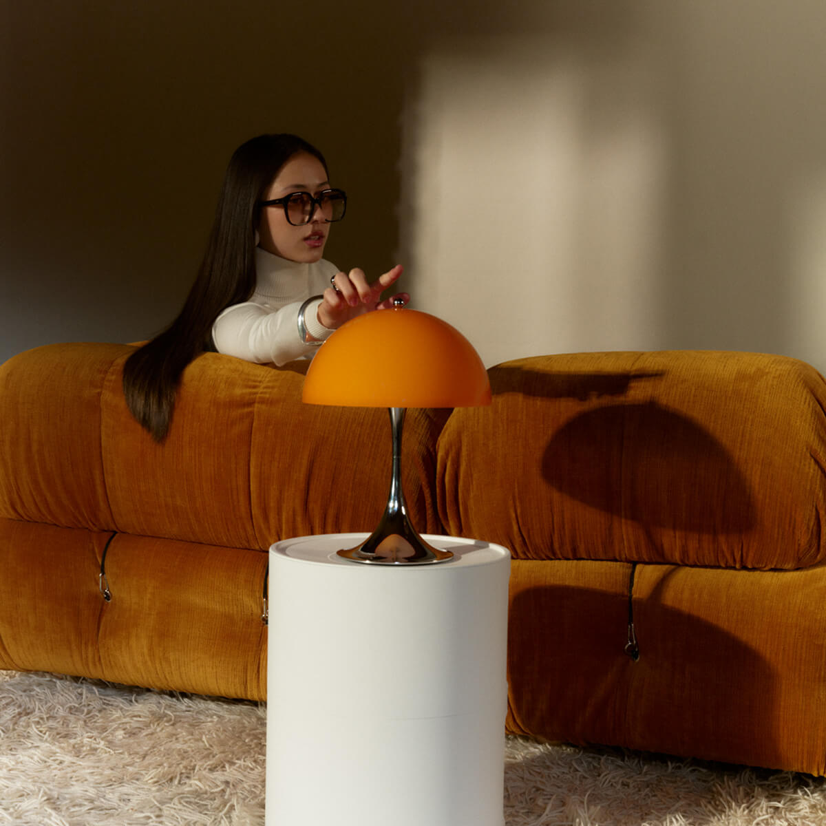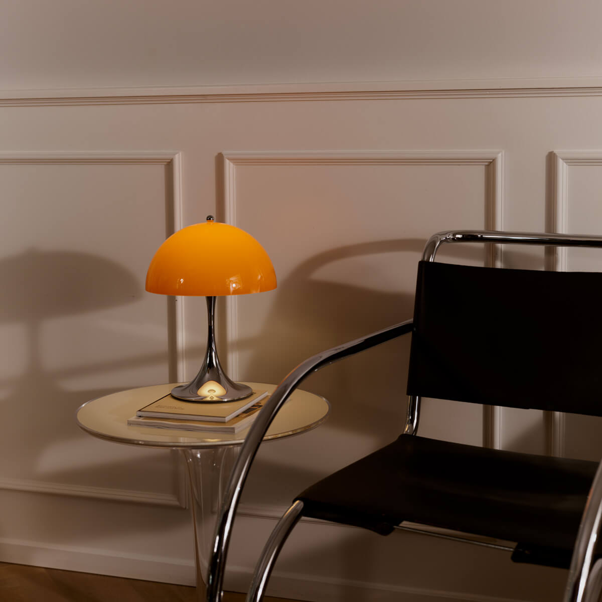 The Panthella lamp is characterized by its pleasantly soft, glare-free light. The opal shade distributes the light evenly and reflects it gently downward, while the organic shapes of the shade and base act as reflectors. This creates warm, atmospheric lighting that makes rooms feel cozy and brings out colors harmoniously.