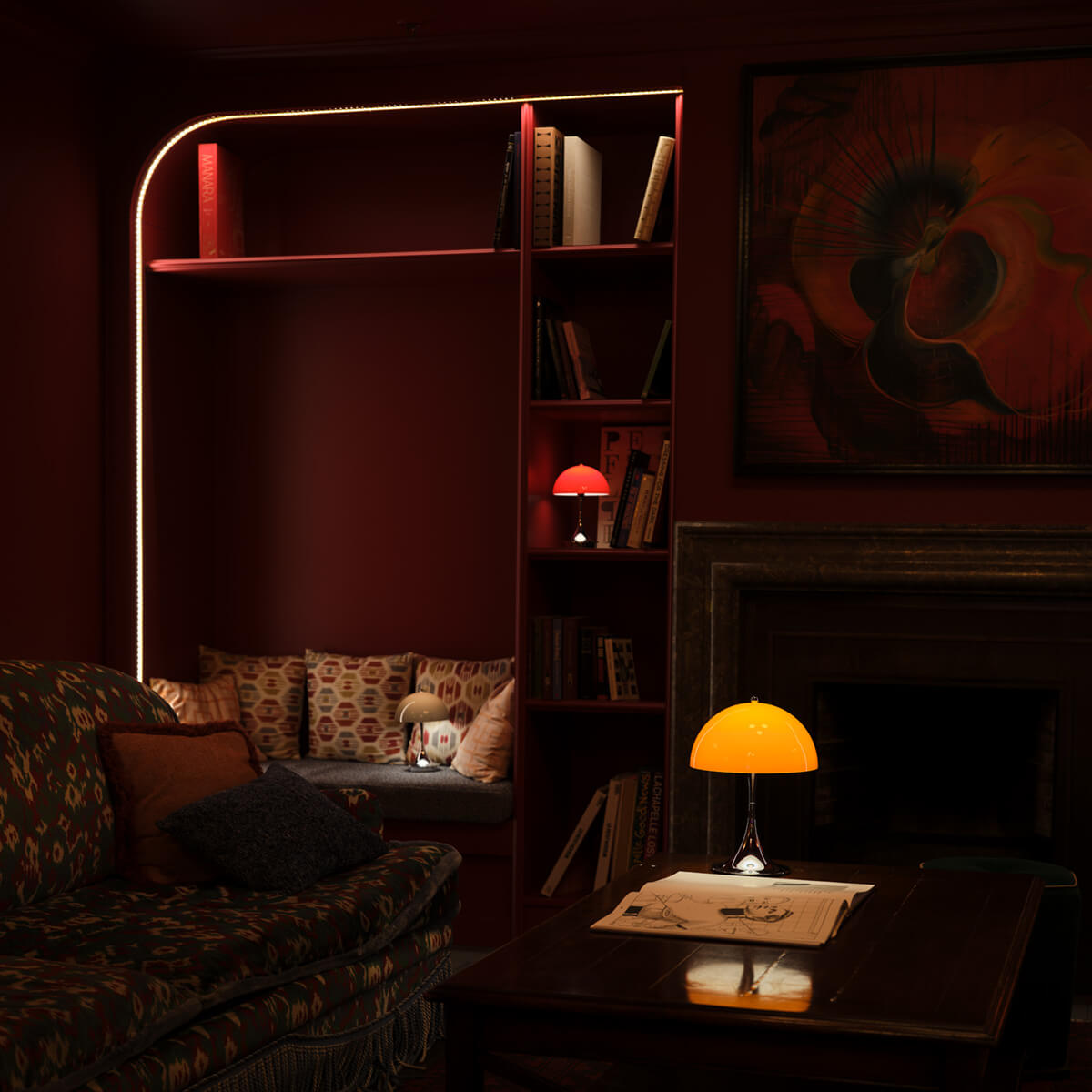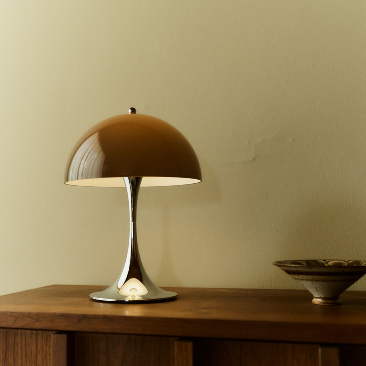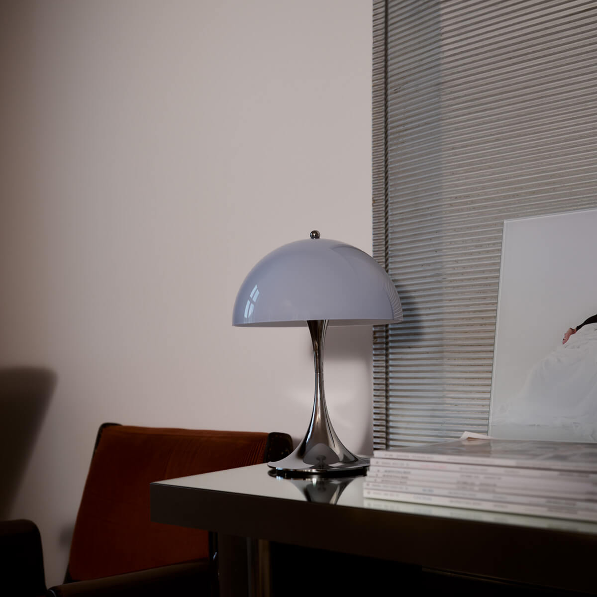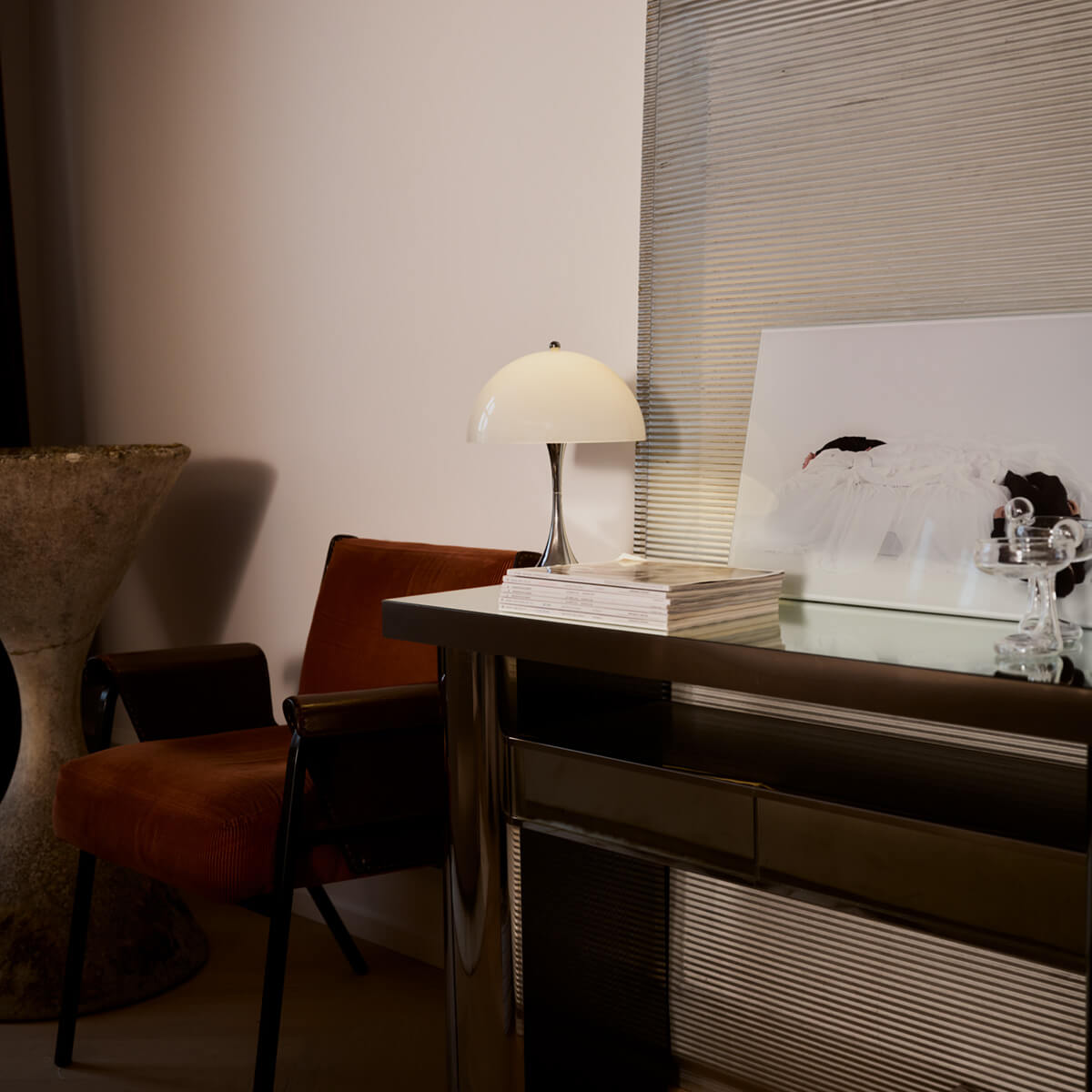 The Panthella lamp is characterized by its pleasantly soft, glare-free light. The opal shade distributes the light evenly and reflects it gently downward, while the organic shapes of the shade and base act as reflectors. This creates warm, atmospheric lighting that makes rooms feel cozy and brings out colors harmoniously.