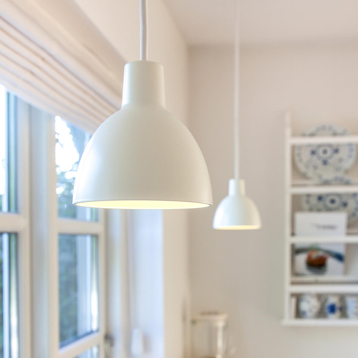Ein ausgeklügeltes Refelktorteil im Innern des Schirms gewährleistet ein vollkommen blendfreies, gleichmäßiges und nach unten hin ausstrahlendes Licht. Dies macht die Louis Poulsen Toldbod 120 zu einem modernen und zugleich unaufdringlichen Lichtobjekt in Küche, Wohn- und Essbereich.