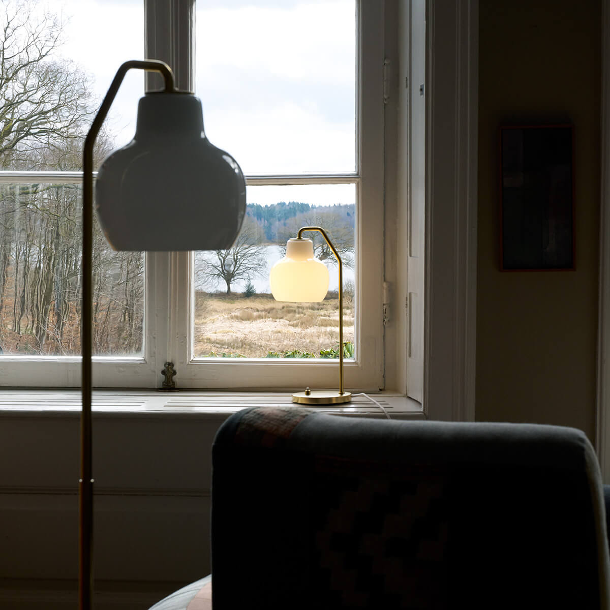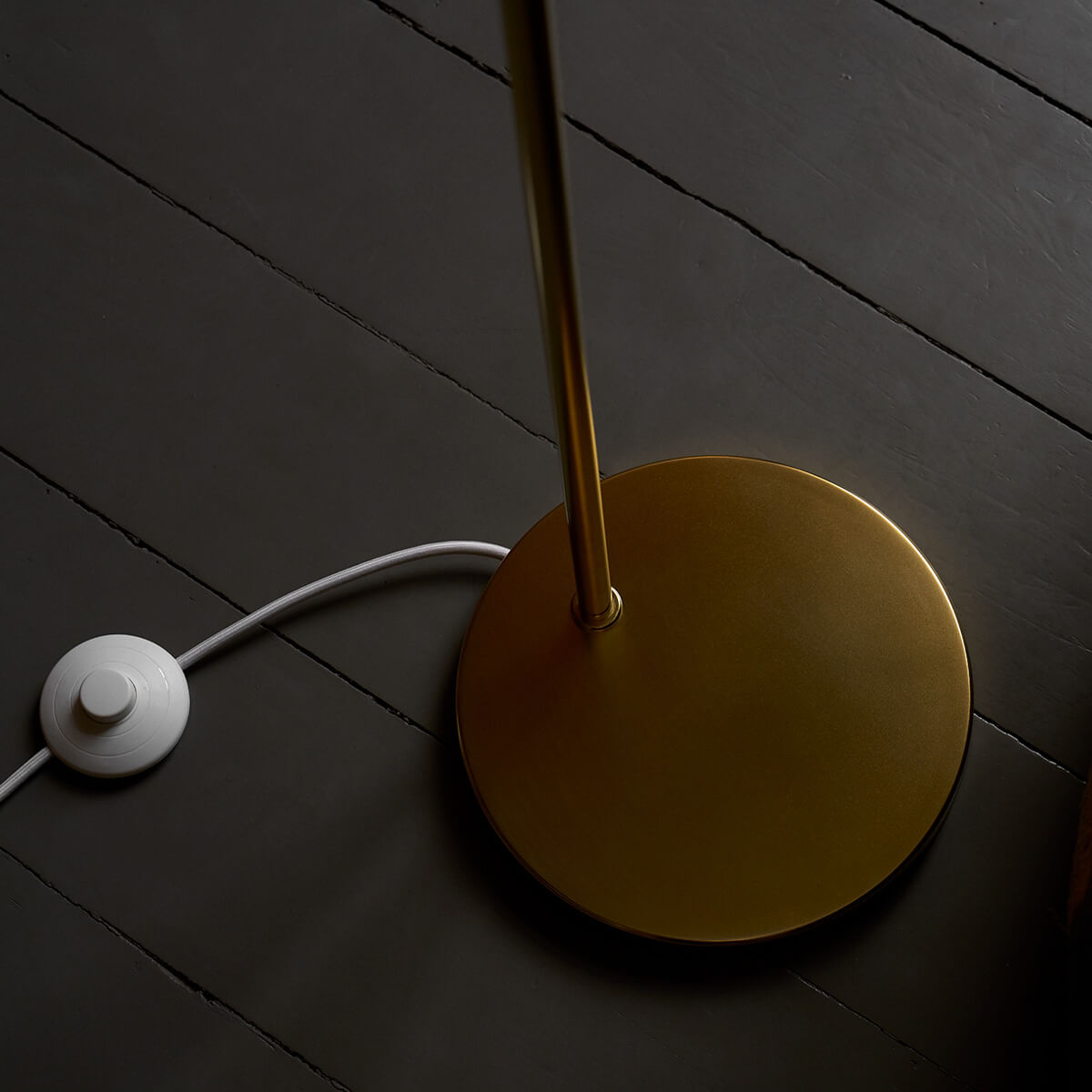 Ihr Schirm besteht aus mundgeblasenem, dreischichtigem Opalglas, das für eine gleichmäßige, weiche Lichtausstrahlung sorgt und zugleich ein warmes, blendfreies Raumlicht schafft. Der Schirm sitzt auf einem schlanken Gestell aus unbehandeltem Messing mit feiner Satinierung, dessen natürlicher Glanz durch die Jahre hinweg eine individuelle Patina entwickelt. Diese Patina verleiht jeder Leuchte einen unverwechselbaren Charakter und lässt sich bei Bedarf durch Polieren entfernen. So entsteht ein lebendiges, wandelbares Materialbild, das Tradition und Moderne perfekt vereint.