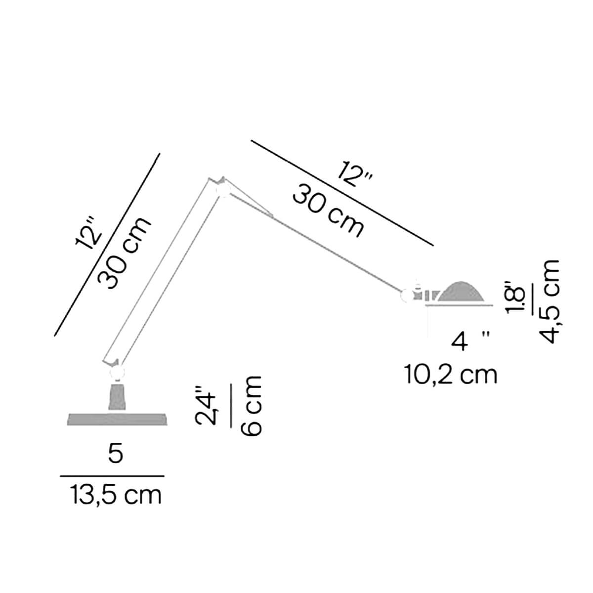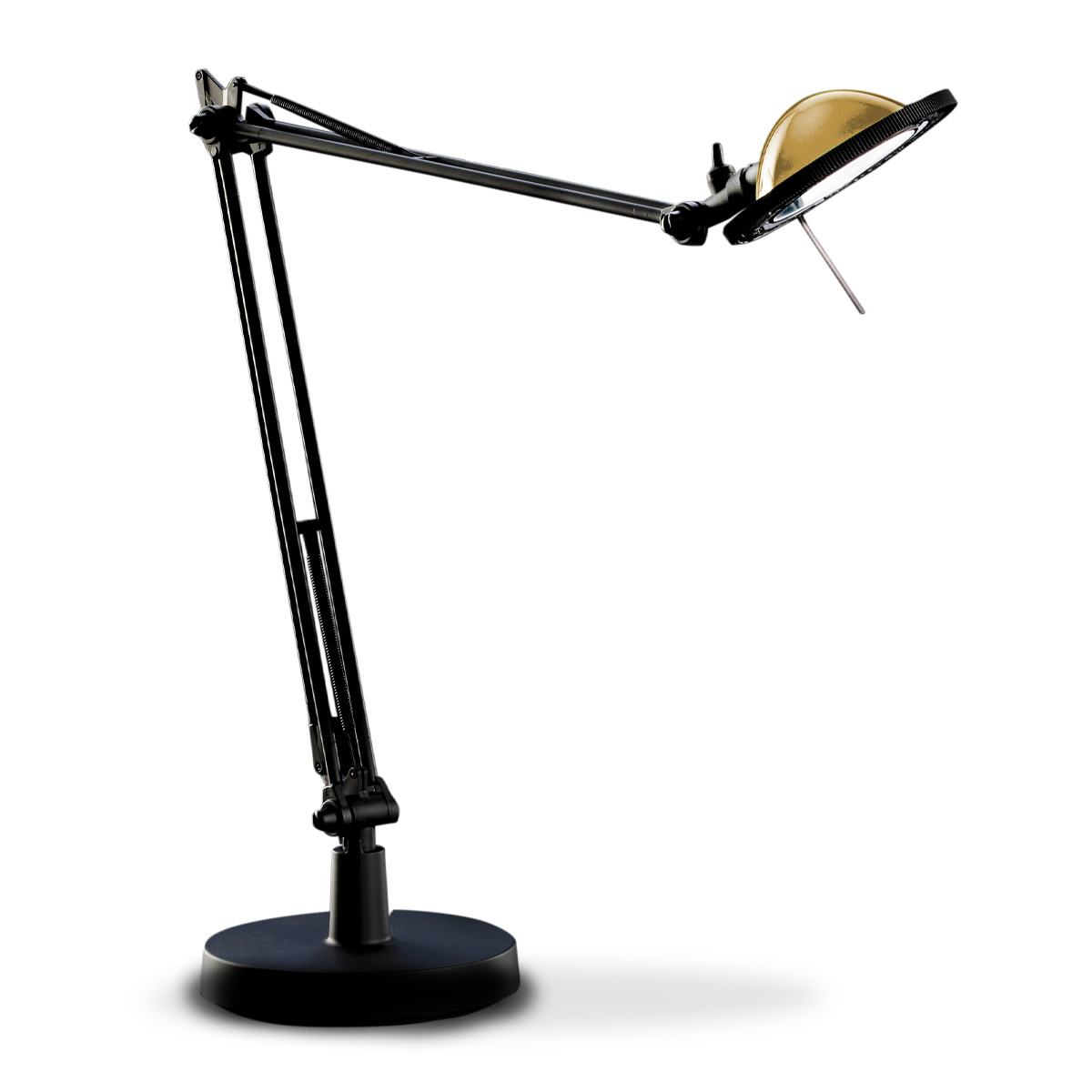 Die kleine Schreibtischleuchte dient einer direkten Zonenbeleuchtung, die sich dank der schwenkbaren Arme und des um 360° drehbaren Leuchtenkopfes den individuellen Bedürfnissen entsprechend ausrichten lässt.