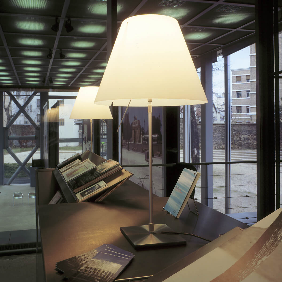 Kennzeichnendes Element der Luceplan Costanza Leuchtenserie ist der konisch geformte Schirm aus siebbedrucktem Polycarbonat. Er ist auswechselbar, von geringem Gewicht und einfach zu reinigen. Getragen wird er von lediglich zwei Haltepunkten, sodass er, wenn er angestoßen wird, sanft hin- und herschaukelt, um sich auszubalancieren. Der Fuß der Costanza Tavolo Tischleuchte ist aus Aluminium gefertigt.