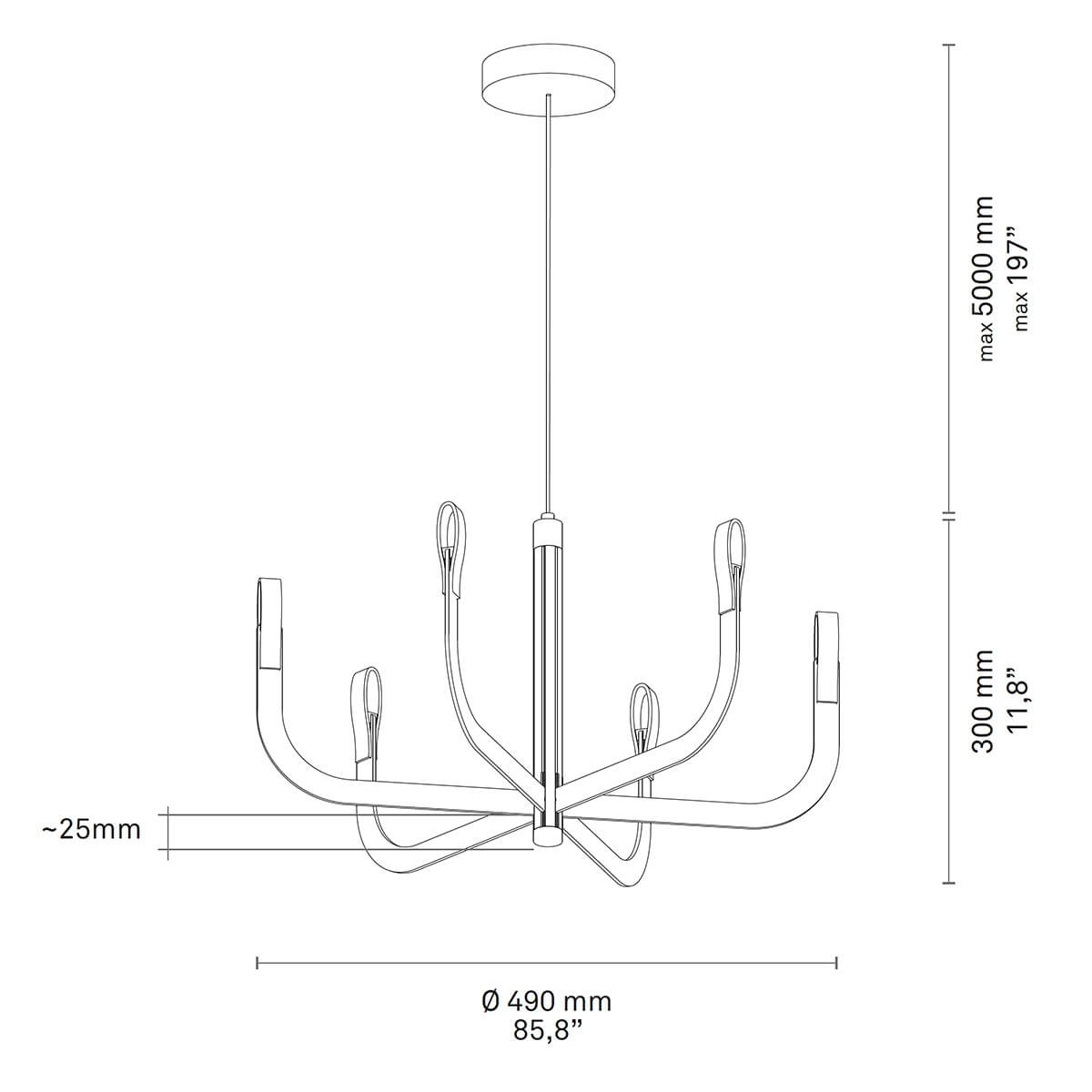 Die mittige Zylindereinheit aus Aluminium bildet das visuelle Zentrum der Leuchte. Von dort aus verzweigen sich die eleganten Lichtarme, die mit Diffusoren aus Technopolymer besetzt sind. Die filigrane Konstruktion scheint nahezu schwerelos im Raum zu schweben und verleiht jedem Ambiente eine besondere Note – zurückhaltend, modern und doch tief verwurzelt in der Tradition des Leuchtenhandwerks.