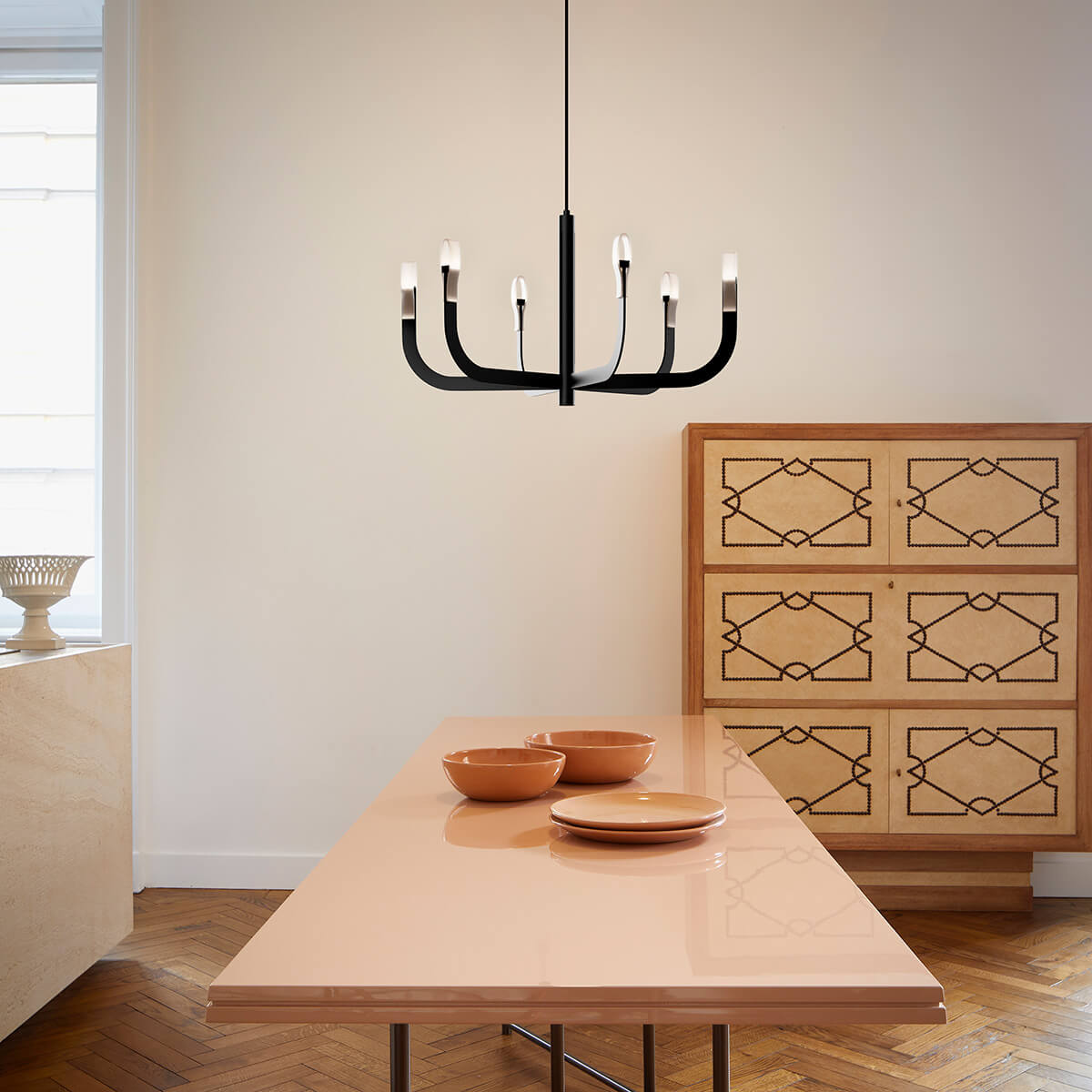 Mit der J-us präsentiert Luceplan eine reizvolle Neuinterpretation des klassischen Kronleuchters. Die Pendellampe besticht durch ihre grafisch reduzierte Form, die Raffinesse, technische Innovation und emotionale Lichtwirkung auf elegante Weise miteinander kombiniert. Sechs gebogene Arme formen einen puristischen Lichtring, der sich dezent und dennoch ausdrucksstark über Esstische, Theken oder Loungebereiche legt – im privaten Wohnbereich ebenso wie in gehobenen gastronomischen Einrichtungen und Hotels.