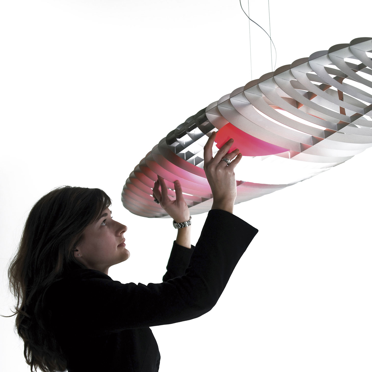 Hierbei ergeben die Aluminiumlamellen, aus denen der organisch geschwungene Leuchtenkörper besteht, ein wechselndes visuelles Erscheinungsbild – je nachdem, von welchem Winkel aus man die Queen Titania Sospensione betrachtet: Nahezu transparent erscheint die Hängeleuchte von der Front aus gesehen, als solider Körper hingegen, wird sie von der Seite betrachtet.