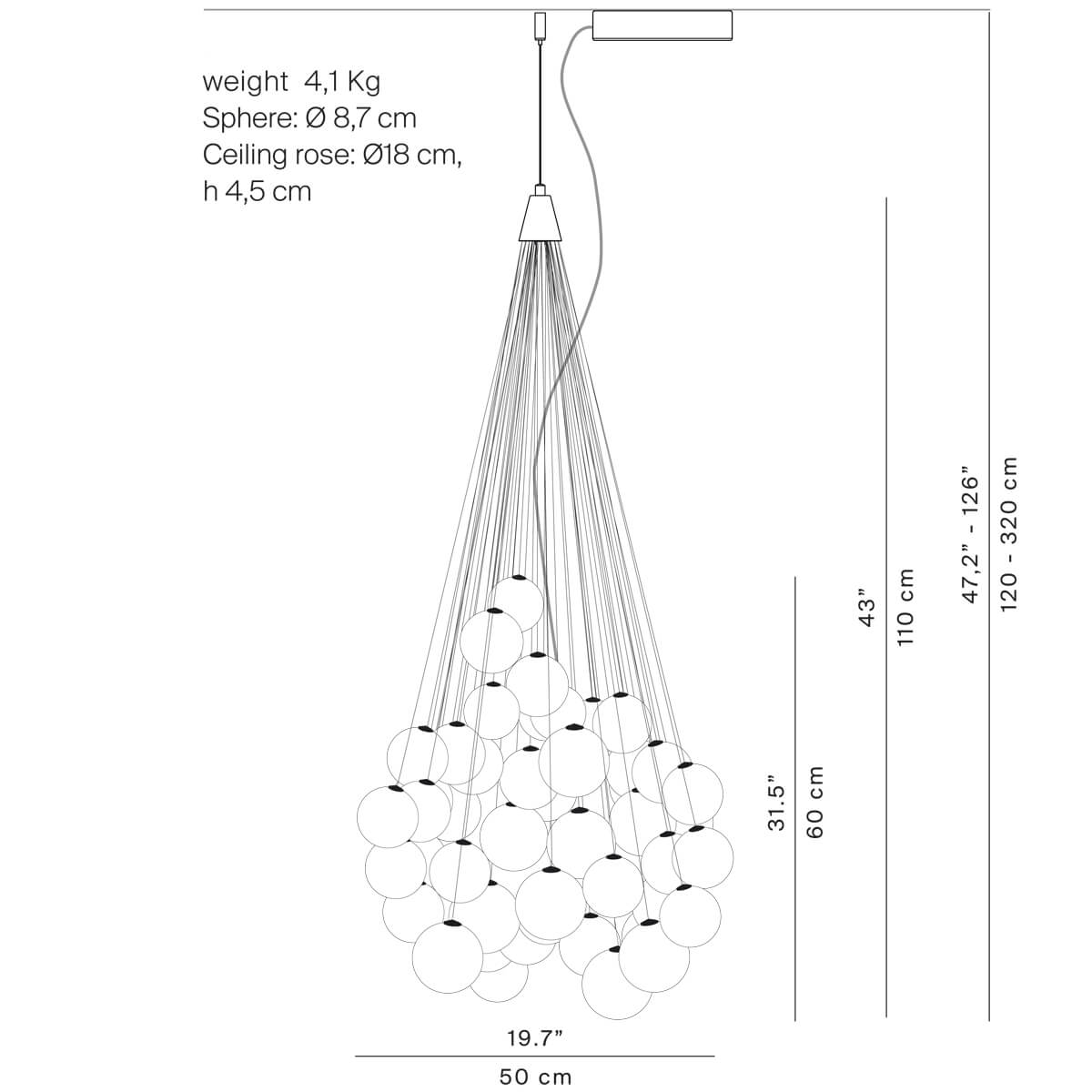 | Material/surface: | Blown borosilicate glass satin white, brushed aluminum, steel rods |