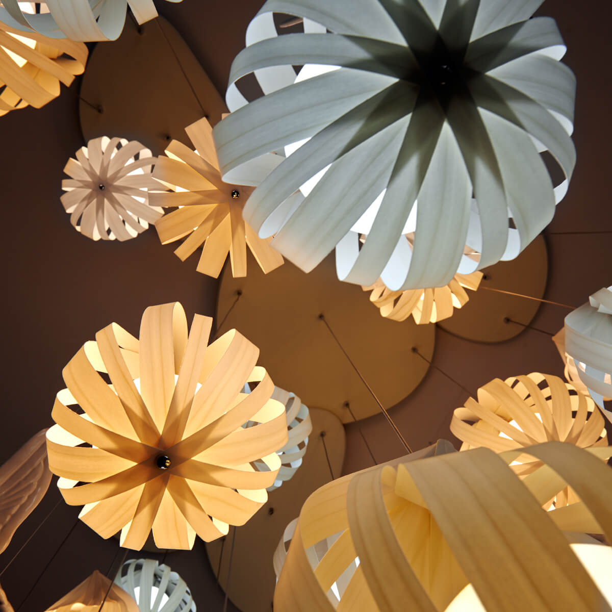 Die Leuchte besteht aus lichtdurchlässigem Echtholzfurnier, das aus nachhaltig bewirtschafteten, FSC®-zertifizierten Quellen stammt. Dank der innovativen Timberlite®-Veredelung bleibt das Holz dauerhaft flexibel, stabil und langlebig – ohne chemische Zusätze. Jeder Holzstreifen besitzt seine eigene Maserung und Struktur, was jedes Pendel zu einem individuellen Unikat macht.