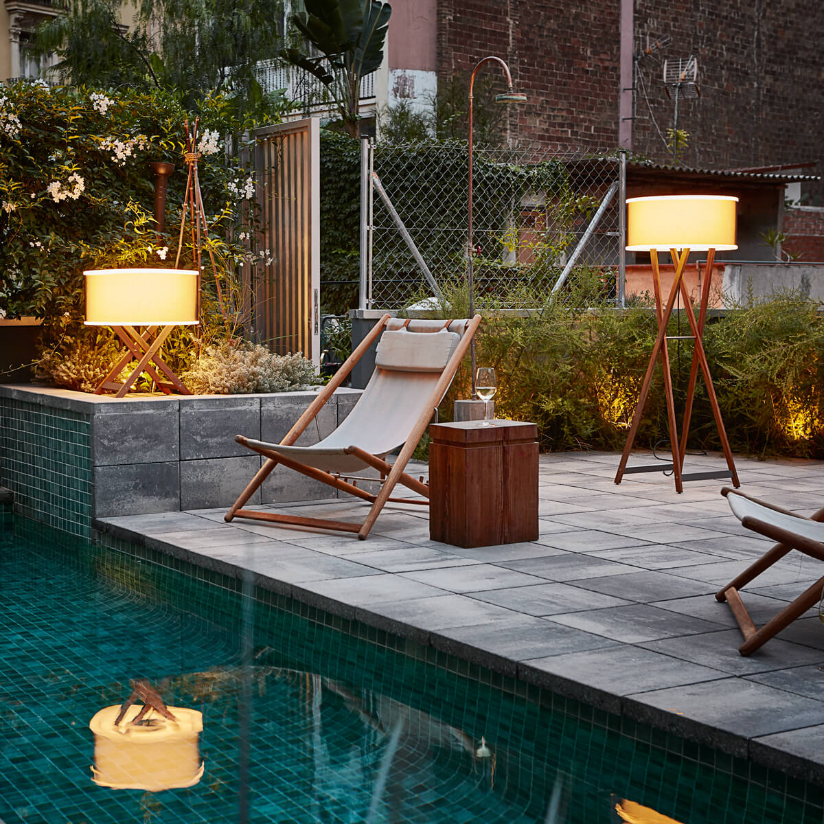Die Stehlampe erinnert in ihrer Konstruktion an eine klassische Staffelei oder an die minimalistischen Metalltische einer Bar. Ihr Gestell besteht aus edlem, witterungsbeständigem Iroko-Holz, das durch seine warme Maserung für natürliche Eleganz sorgt und der Lampe einen Hauch mediterranen Charme verleiht.