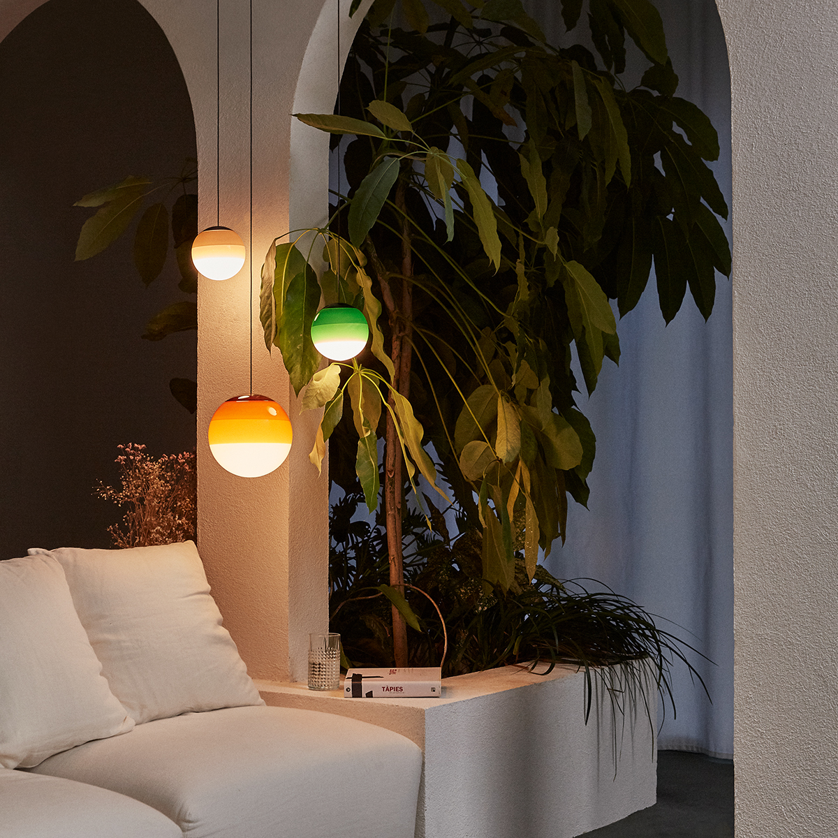 Die Magie dieser Pendellampe entsteht durch ihre farbige Glaskugel, die in einem speziellen Verfahren mit mehreren Farbschichten überzogen wird. Durch diesen handwerklichen Prozess entstehen charakteristische Farbverläufe mit sanften Übergängen, die das Licht auf faszinierende Weise filtern. Eingeschaltet sorgt die Leuchte für ein warmes, weiches Licht, das den Raum in eine angenehme Atmosphäre hüllt. Doch auch ausgeschaltet bleibt die Dipping Light 20 ein kunstvoller Blickfang. Das nach unten gerichtete Licht schafft eine harmonische Ausleuchtung, ideal für Tische, Theken oder Lichtinseln im Raum.