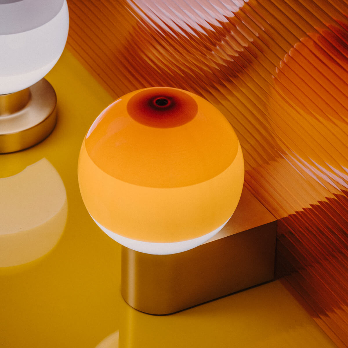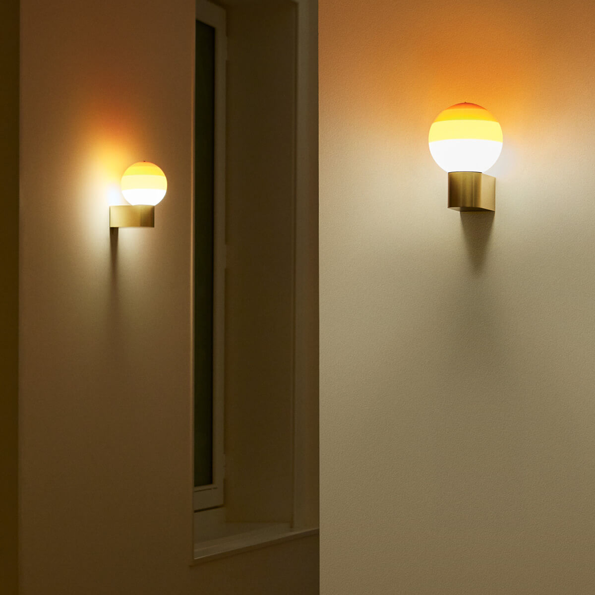 Das Design der Dipping Light A1-13 LED Wandleuchte basiert auf einem künstlerischen Experiment: Jordi Canudas tauchte eine leuchtende Glühlampe mehrfach in Farbe, wodurch konzentrische Farbringe entstanden. Dieses Verfahren erzeugt einen charakteristischen Farbverlauf, der das Licht sanft filtert und in warmen Nuancen im Raum verteilt. Jede Lampe wird von Hand gefertigt und ist daher ein einzigartiges Unikat.