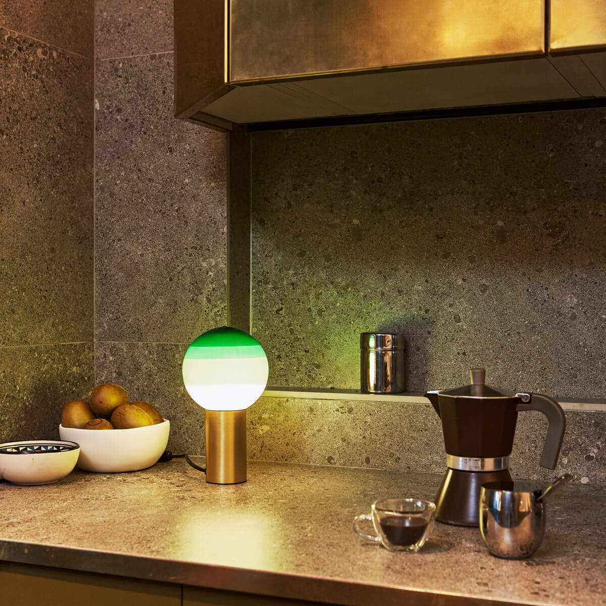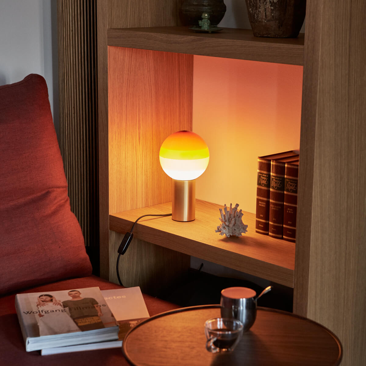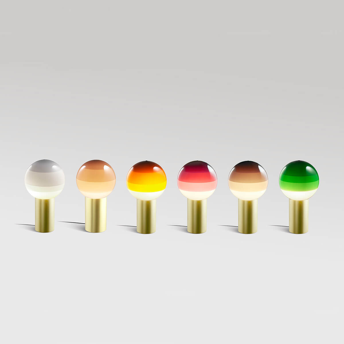 Erhältlich ist die LED-Tischleuchte in sechs Farbnuancen, die die Ausdruckskraft und Lichtfarbe der Dipping Light variieren: Leuchtendes Bernstein und Grün wecken Assoziationen an die Farbpalette der 1970er-Jahre, zartes Creme und Bordeaux verleiht den Lampen eine elegante, sanfte Note. Zeitloser gestaltet es sich mit der Version in leicht abgetöntem Weiß, das einen schönen Kontrast zum geschmackvollen Messingfuß bildet.