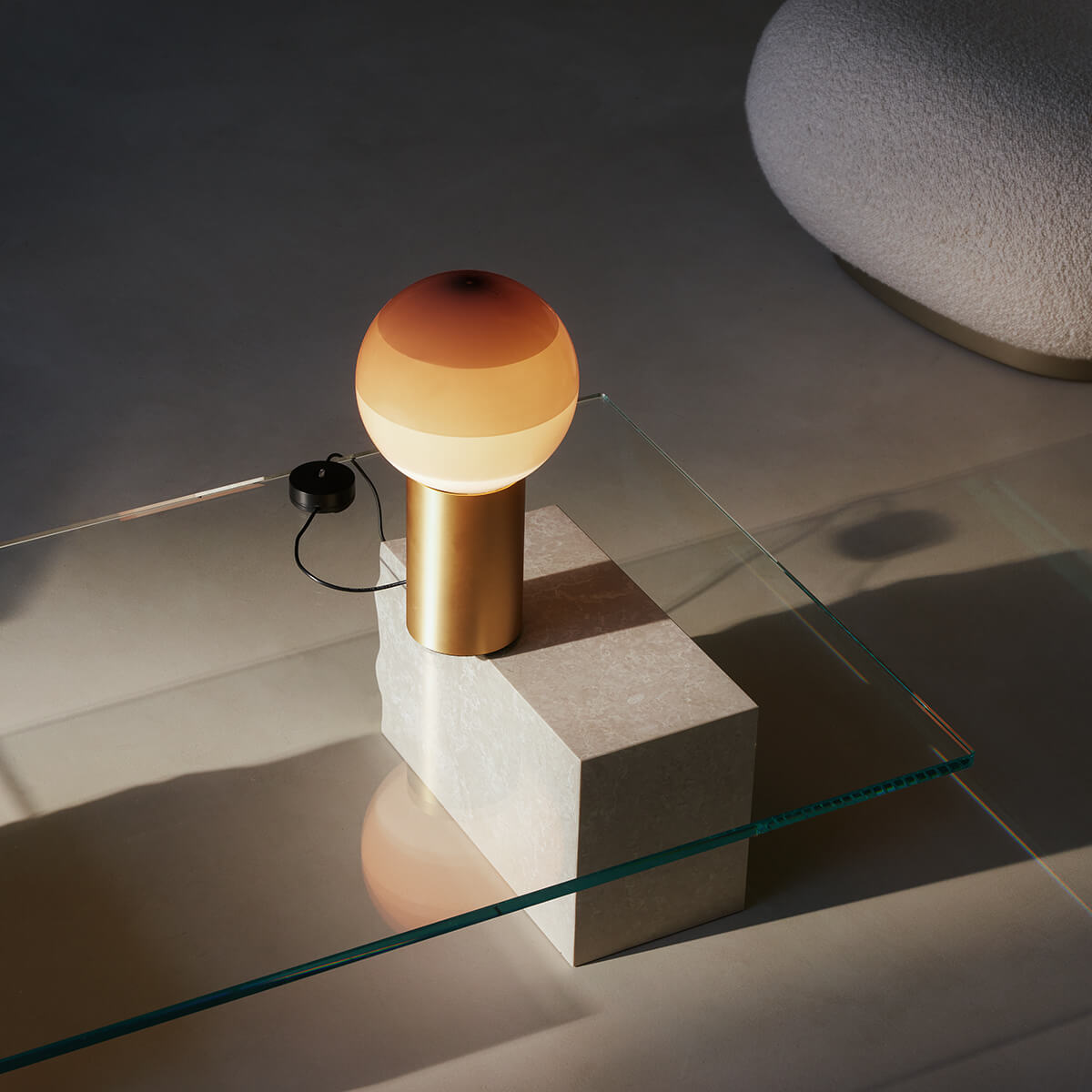 Das Highlight der Leuchte ist ihr kugelförmiger Schirm aus geblasenem Glas, der von mehreren Farbaufträgen überzogen ist – Ergebnis einer aufwendigen Eintauchtechnik. Jede Kugel wird mehrfach in Farbe getaucht, wodurch konzentrische Kreise mit unterschiedlichen Tonalitäten entstehen. Hieraus ergibt sich eine harmonische Lichtstreuung, die sanfte Nuancen im Raum erzeugt und für eine außergewöhnliche Lichtstimmung sorgt. Der Schirm ruht auf einem eleganten Sockel aus gebürstetem Messing, der einen stilvollen Kontrast zu den farbigen Gläsern bildet.