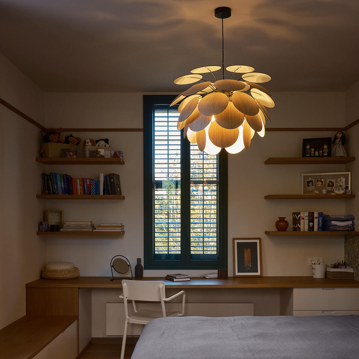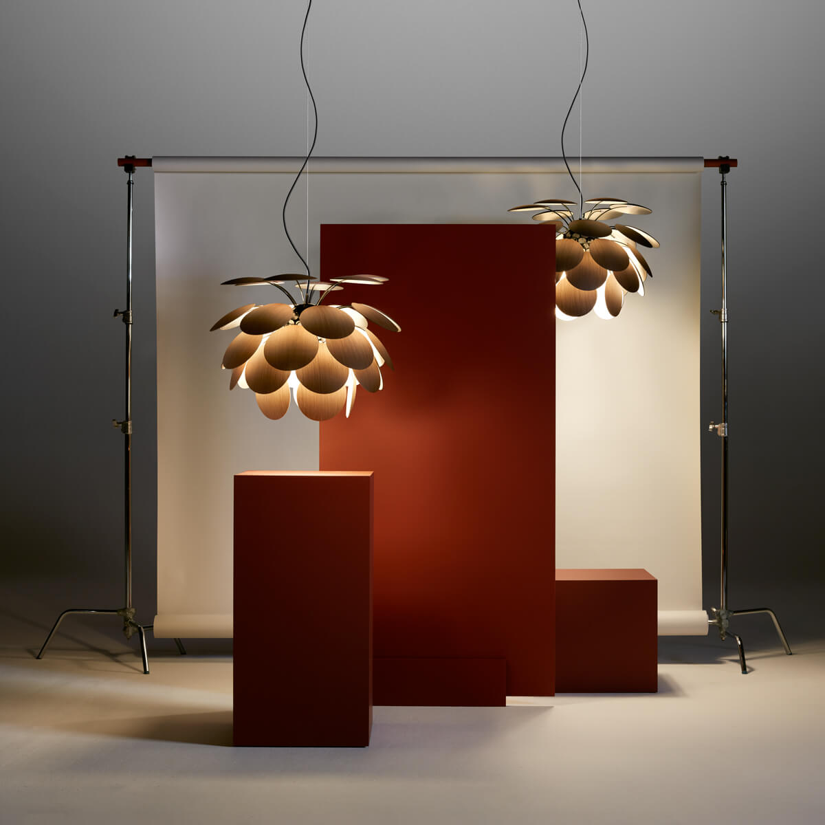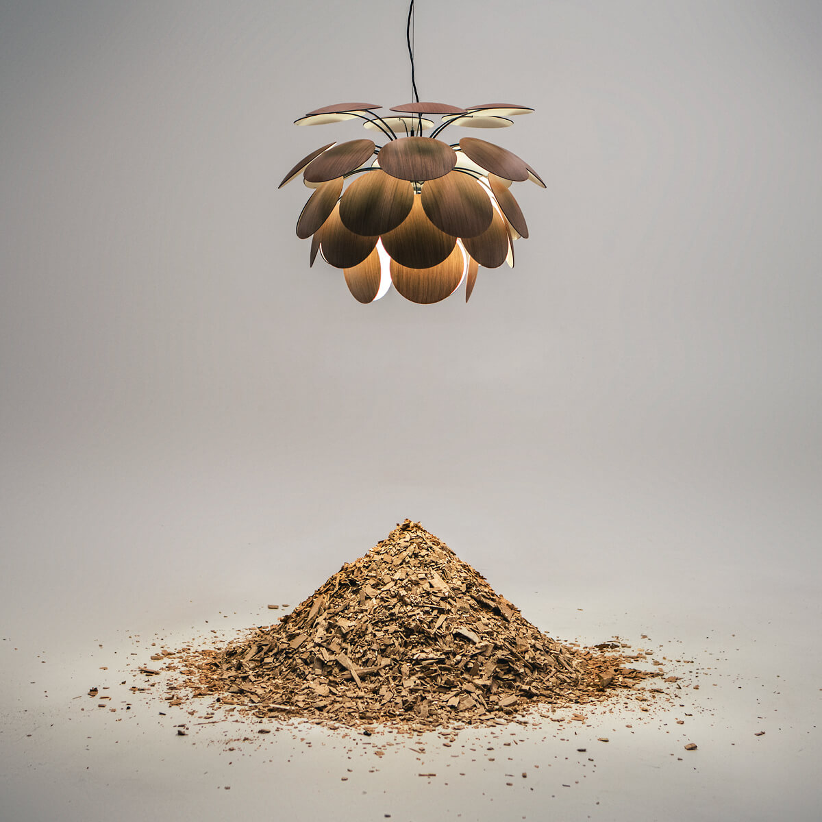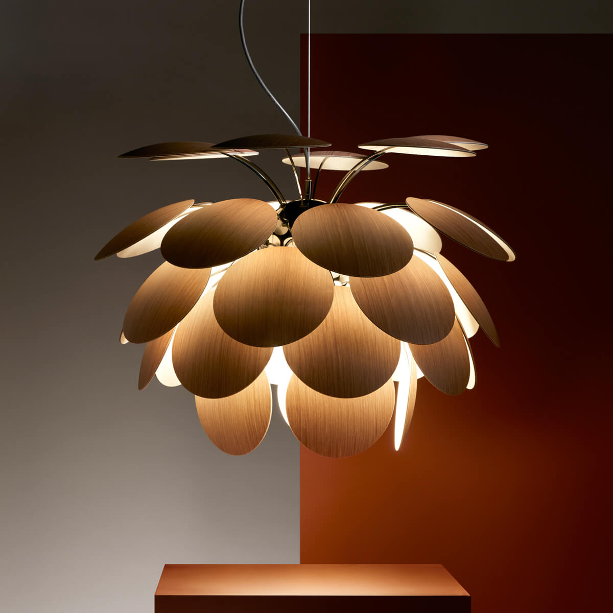 - Korpus aus 35 lichtundurchlässigen Scheiben aus gepresstem Schichtholz (amerikanische Eiche)
