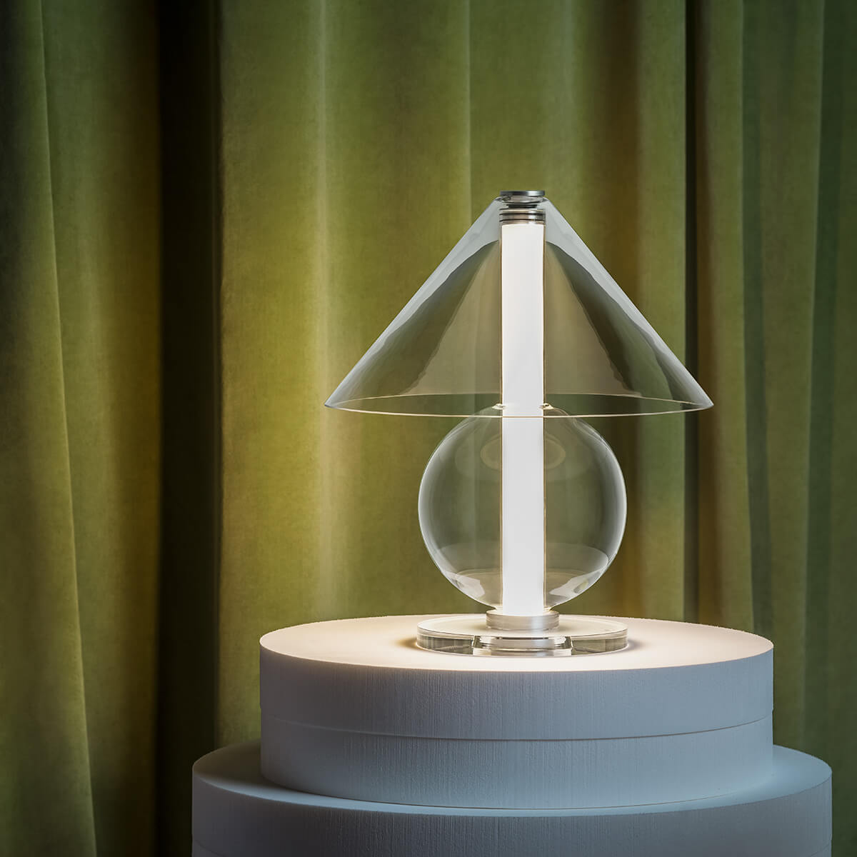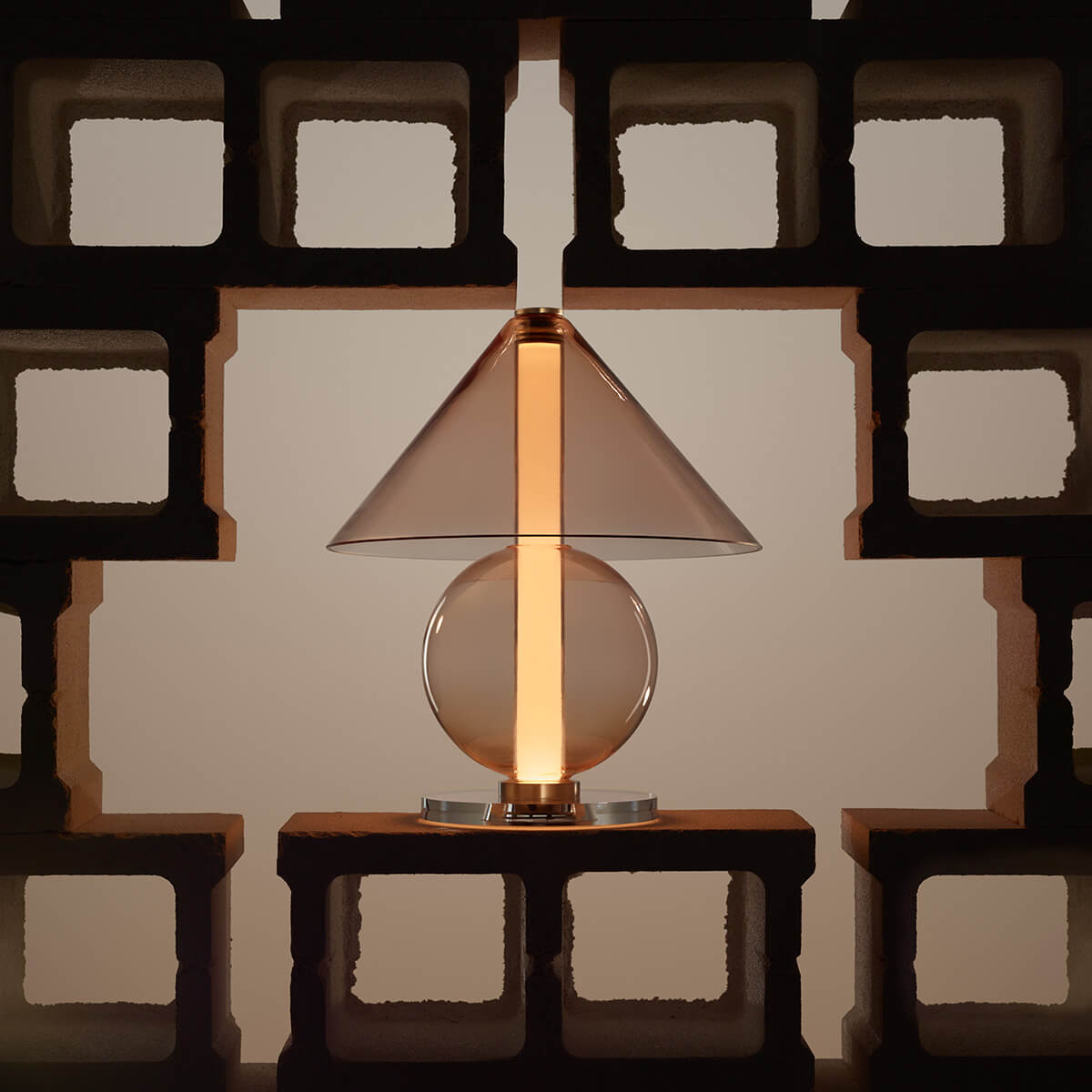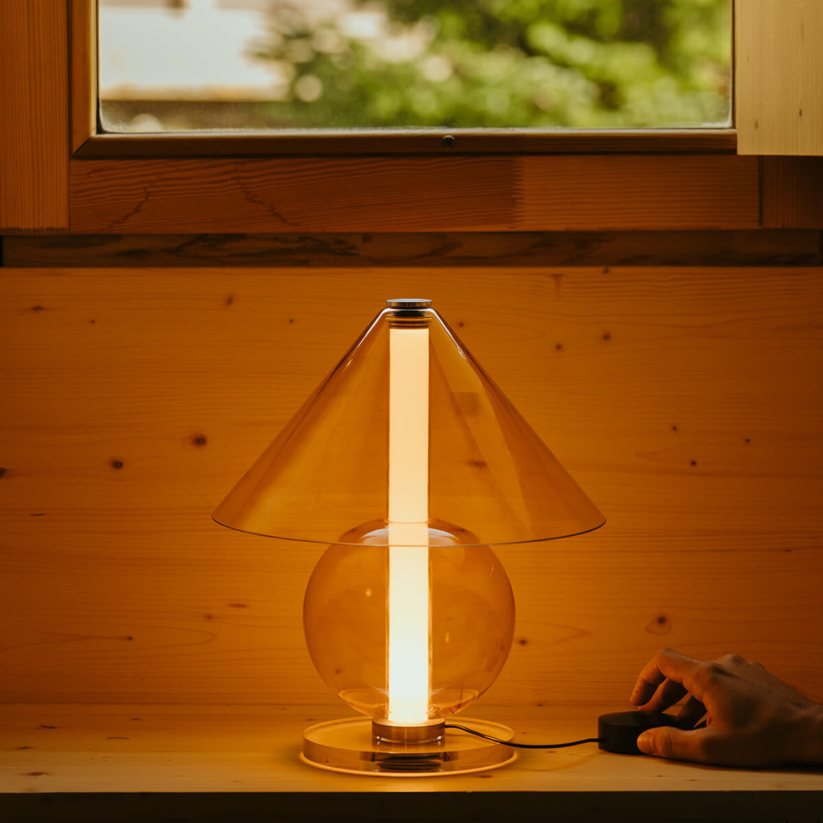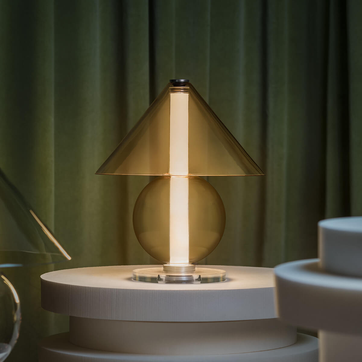 Die Fragile besticht durch ihre Transparenz und Leichtigkeit, die das Licht zu einem integralen Bestandteil des Designs machen. Das klare oder bernsteinfarbene Glas offenbart nicht nur die Lichtquelle, sondern verleiht der Lampe eine schwebende Eleganz, die mühelos mit ihrer Umgebung verschmilzt. Der zylindrische Schirm streut das Licht sanft und diffus, wodurch eine stimmungsvolle Lichtatmosphäre entsteht – ideal für Beistelltische, Sideboards oder als Akzentbeleuchtung im Schlafbereich.