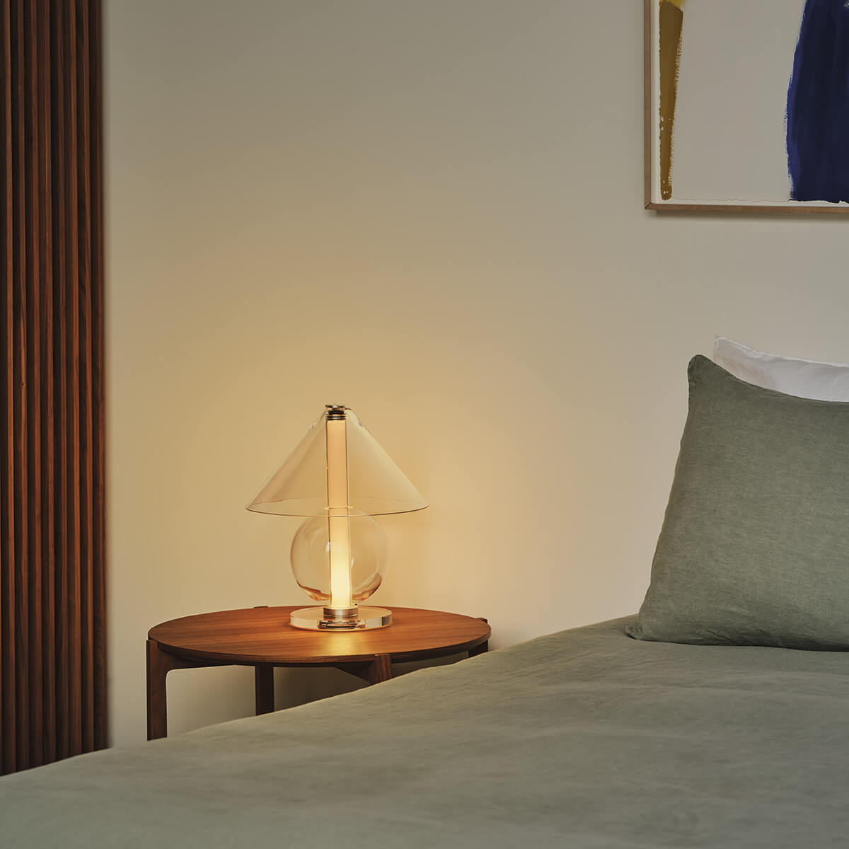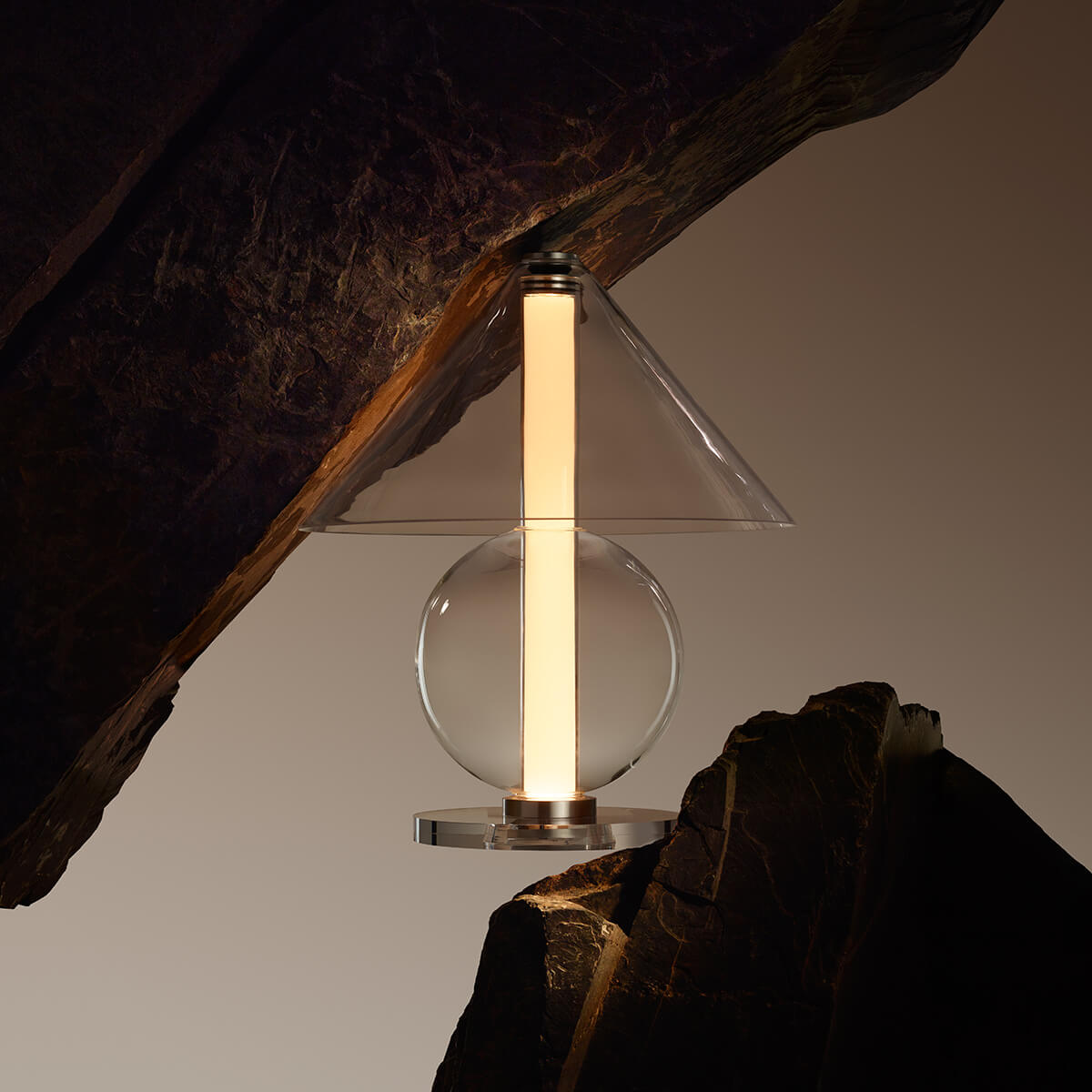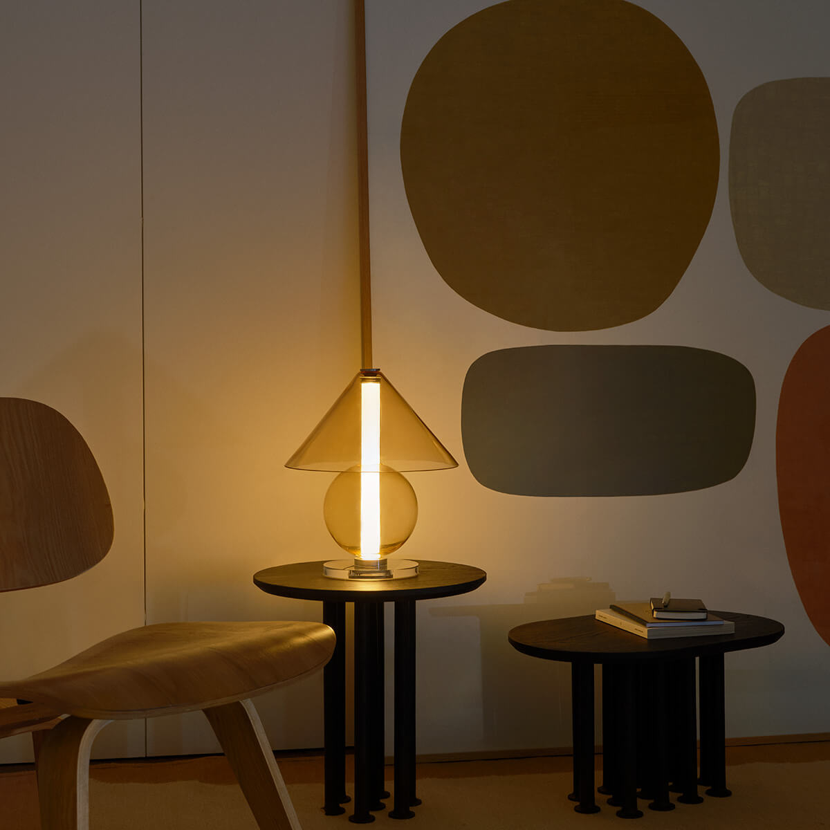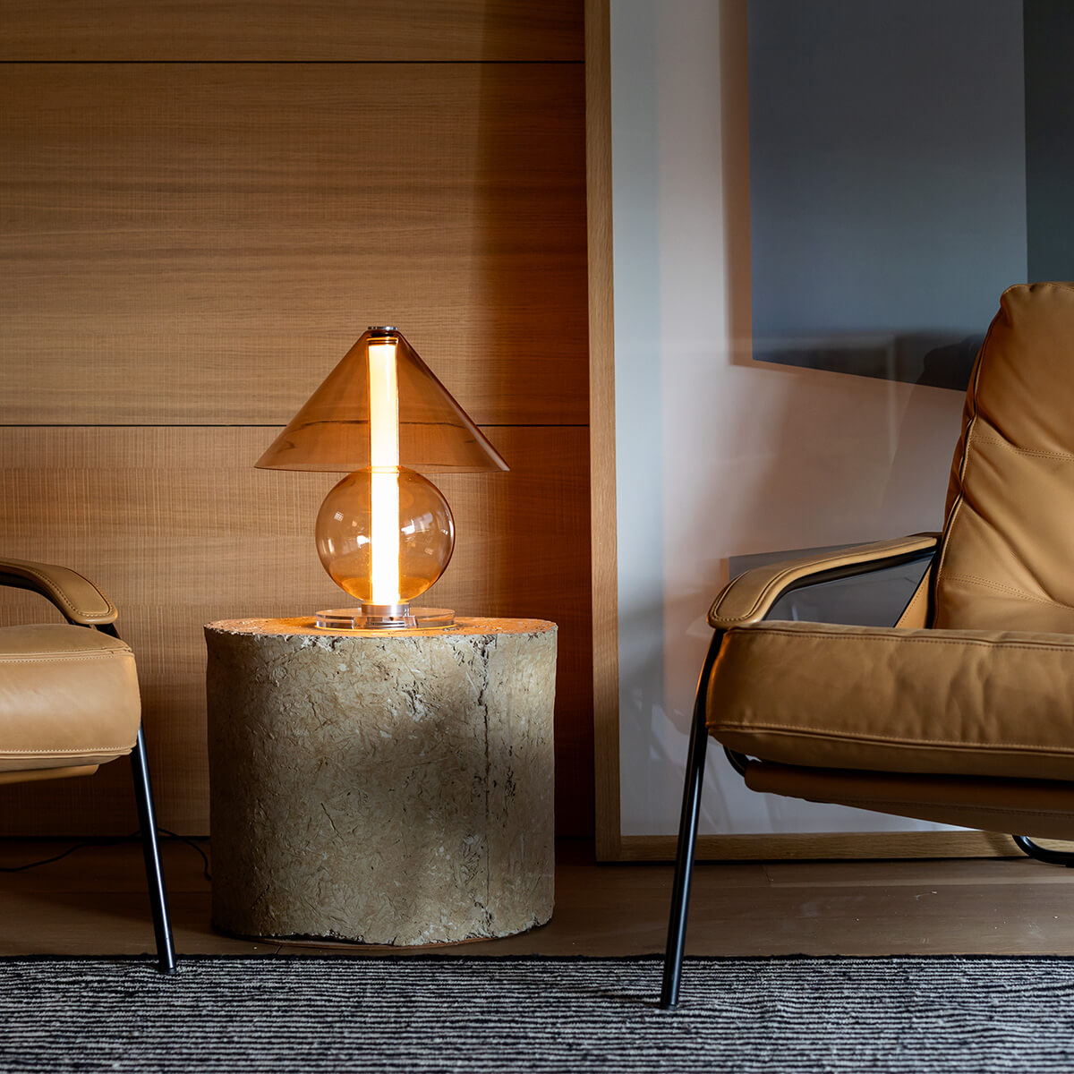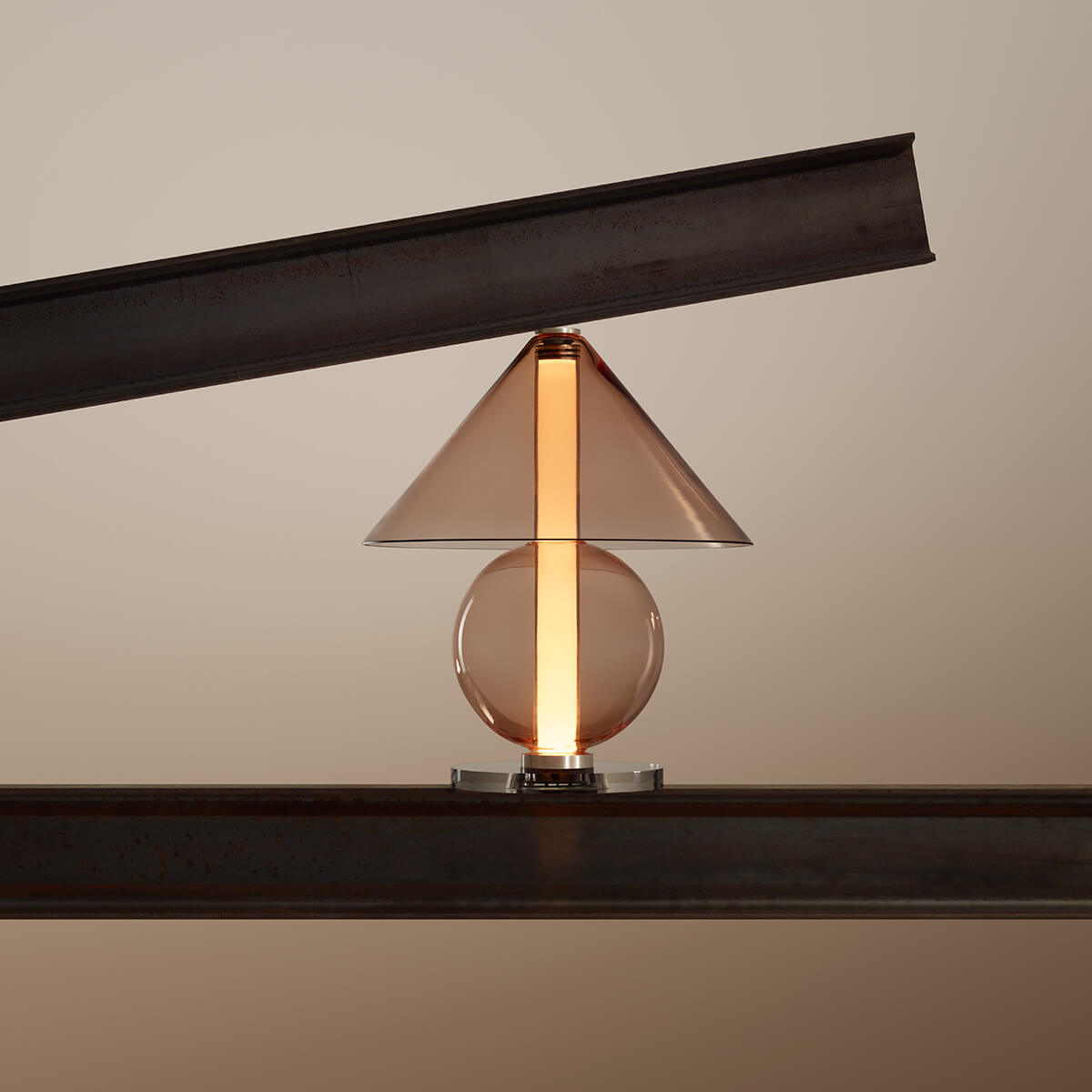 Die Fragile besticht durch ihre Transparenz und Leichtigkeit, die das Licht zu einem integralen Bestandteil des Designs machen. Das klare oder bernsteinfarbene Glas offenbart nicht nur die Lichtquelle, sondern verleiht der Lampe eine schwebende Eleganz, die mühelos mit ihrer Umgebung verschmilzt. Der zylindrische Schirm streut das Licht sanft und diffus, wodurch eine stimmungsvolle Lichtatmosphäre entsteht – ideal für Beistelltische, Sideboards oder als Akzentbeleuchtung im Schlafbereich.